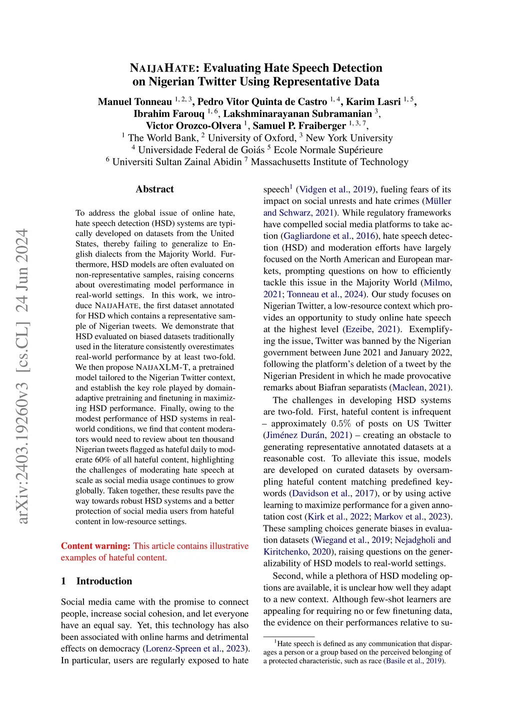 To address the global issue of online hate, hate speech detection (HSD) systems are typically developed on datasets from the United States, thereby failing to generalize to English dialects from the Majority World. Furthermore, HSD models are often evaluated on non-representative samples, raising concerns about overestimating model performance in real-world settings. In this work, we introduce NaijaHate, the first dataset annotated for HSD which contains a representative sample of Nigerian tweets. We demonstrate that HSD evaluated on biased datasets traditionally used in the literature consistently overestimates real-world performance by at least two-fold. We then propose NaijaXLM-T, a pretrained model tailored to the Nigerian Twitter context, and establish the key role played by domain-adaptive pretraining and finetuning in maximizing HSD performance. Finally, owing to the modest performance of HSD systems in real-world conditions, we find that content moderators would need to review about ten thousand Nigerian tweets flagged as hateful daily to moderate 60% of all hateful content, highlighting the challenges of moderating hate speech at scale as social media usage continues to grow globally. Taken together, these results pave the way towards robust HSD systems and a better protection of social media users from hateful content in low-resource settings.