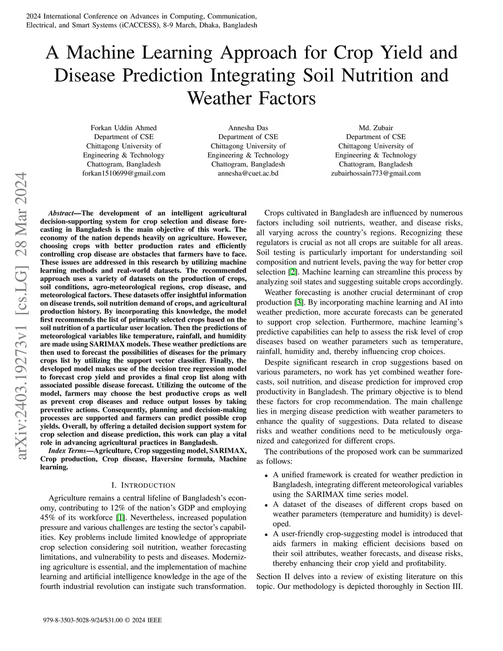 The development of an intelligent agricultural decision-supporting system for crop selection and disease forecasting in Bangladesh is the main objective of this work. The economy of the nation depends heavily on agriculture. However, choosing crops with better production rates and efficiently controlling crop disease are obstacles that farmers have to face. These issues are addressed in this research by utilizing machine learning methods and real-world datasets. The recommended approach uses a variety of datasets on the production of crops, soil conditions, agro-meteorological regions, crop disease, and meteorological factors. These datasets offer insightful information on disease trends, soil nutrition demand of crops, and agricultural production history. By incorporating this knowledge, the model first recommends the list of primarily selected crops based on the soil nutrition of a particular user location. Then the predictions of meteorological variables like temperature, rainfall, and humidity are made using SARIMAX models. These weather predictions are then used to forecast the possibilities of diseases for the primary crops list by utilizing the support vector classifier. Finally, the developed model makes use of the decision tree regression model to forecast crop yield and provides a final crop list along with associated possible disease forecast. Utilizing the outcome of the model, farmers may choose the best productive crops as well as prevent crop diseases and reduce output losses by taking preventive actions. Consequently, planning and decision-making processes are supported and farmers can predict possible crop yields. Overall, by offering a detailed decision support system for crop selection and disease prediction, this work can play a vital role in advancing agricultural practices in Bangladesh.