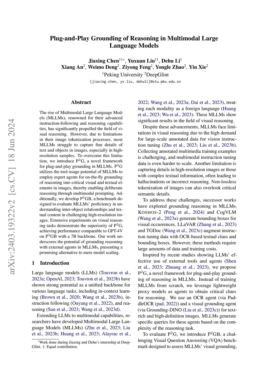 The rise of Multimodal Large Language Models (MLLMs), renowned for their advanced instruction-following and reasoning capabilities, has significantly propelled the field of visual reasoning. However, due to limitations in their image tokenization processes, most MLLMs struggle to capture fine details of text and objects in images, especially in high-resolution samples. To overcome this limitation, we introduce P2G, a novel framework for plug-and-play grounding in MLLMs. P2G utilizes the tool-usage potential of MLLMs to employ expert agents for on-the-fly grounding of reasoning into critical visual and textual elements in images, thereby enabling deliberate reasoning through multimodal prompting. Additionally, we develop P2GB, a benchmark designed to evaluate MLLMs' proficiency in understanding inter-object relationships and textual content in challenging high-resolution images. Extensive experiments on visual reasoning tasks demonstrate the superiority of P2G, achieving performance comparable to GPT-4V on P2GB with a 7B backbone. Our work underscores the potential of grounding reasoning with external agents in MLLMs, presenting a promising alternative to mere model scaling.