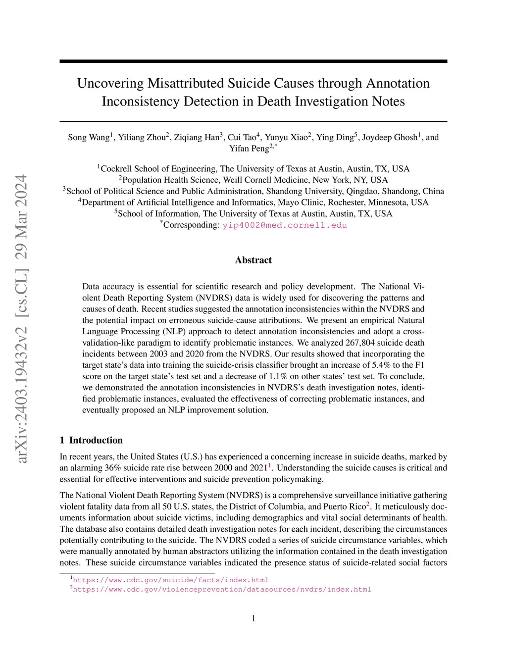 Data accuracy is essential for scientific research and policy development. The National Violent Death Reporting System (NVDRS) data is widely used for discovering the patterns and causes of death. Recent studies suggested the annotation inconsistencies within the NVDRS and the potential impact on erroneous suicide-cause attributions. We present an empirical Natural Language Processing (NLP) approach to detect annotation inconsistencies and adopt a cross-validation-like paradigm to identify problematic instances. We analyzed 267,804 suicide death incidents between 2003 and 2020 from the NVDRS. Our results showed that incorporating the target state's data into training the suicide-crisis classifier brought an increase of 5.4% to the F-1 score on the target state's test set and a decrease of 1.1% on other states' test set. To conclude, we demonstrated the annotation inconsistencies in NVDRS's death investigation notes, identified problematic instances, evaluated the effectiveness of correcting problematic instances, and eventually proposed an NLP improvement solution.