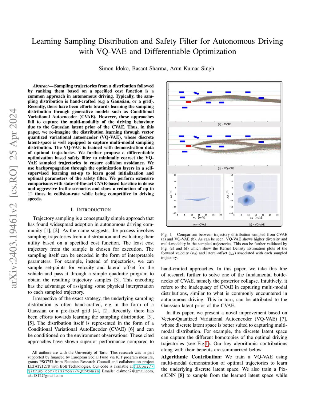 Sampling trajectories from a distribution followed by ranking them based on a specified cost function is a common approach in autonomous driving. Typically, the sampling distribution is hand-crafted (e.g a Gaussian, or a grid). Recently, there have been efforts towards learning the sampling distribution through generative models such as Conditional Variational Autoencoder (CVAE). However, these approaches fail to capture the multi-modality of the driving behaviour due to the Gaussian latent prior of the CVAE. Thus, in this paper, we re-imagine the distribution learning through vector quantized variational autoencoder (VQ-VAE), whose discrete latent-space is well equipped to capture multi-modal sampling distribution. The VQ-VAE is trained with demonstration data of optimal trajectories. We further propose a differentiable optimization based safety filter to minimally correct the VQVAE sampled trajectories to ensure collision avoidance. We use backpropagation through the optimization layers in a self-supervised learning set-up to learn good initialization and optimal parameters of the safety filter. We perform extensive comparisons with state-of-the-art CVAE-based baseline in dense and aggressive traffic scenarios and show a reduction of up to 12 times in collision-rate while being competitive in driving speeds.