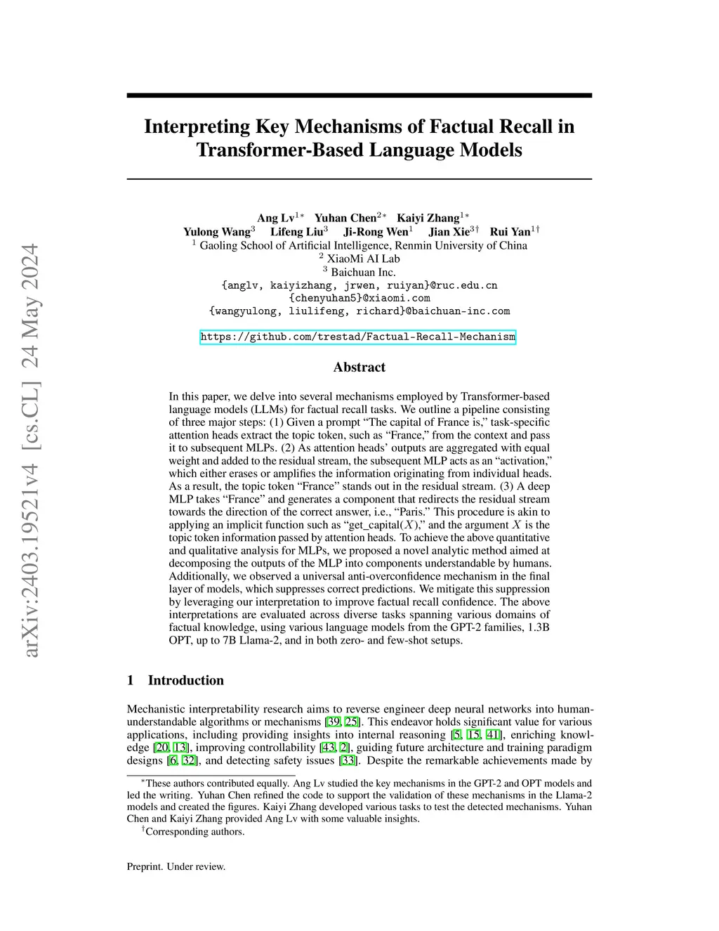 In this paper, we delve into several mechanisms employed by Transformer-based language models (LLMs) for factual recall tasks. We outline a pipeline consisting of three major steps: (1) Given a prompt ``The capital of France is,'' task-specific attention heads extract the topic token, such as ``France,'' from the context and pass it to subsequent MLPs. (2) As attention heads' outputs are aggregated with equal weight and added to the residual stream, the subsequent MLP acts as an ``activation,'' which either erases or amplifies the information originating from individual heads. As a result, the topic token ``France'' stands out in the residual stream. (3) A deep MLP takes ``France'' and generates a component that redirects the residual stream towards the direction of the correct answer, i.e., ``Paris.'' This procedure is akin to applying an implicit function such as ``get\_capital(),'' and the argument is the topic token information passed by attention heads. To achieve the above quantitative and qualitative analysis for MLPs, we proposed a novel analytic method aimed at decomposing the outputs of the MLP into components understandable by humans. Additionally, we observed a universal anti-overconfidence mechanism in the final layer of models, which suppresses correct predictions. We mitigate this suppression by leveraging our interpretation to improve factual recall confidence. The above interpretations are evaluated across diverse tasks spanning various domains of factual knowledge, using various language models from the GPT-2 families, 1.3B OPT, up to 7B Llama-2, and in both zero- and few-shot setups.