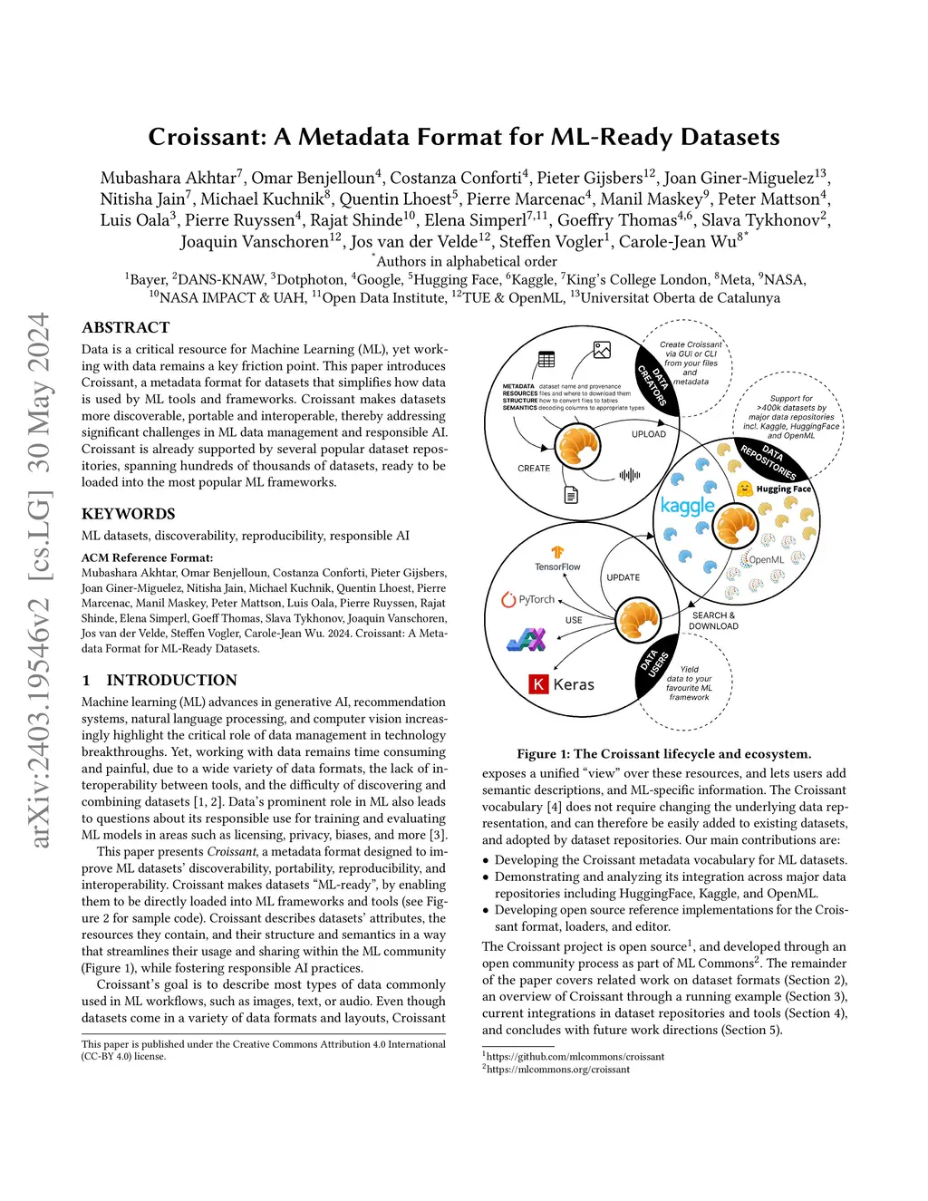 Data is a critical resource for Machine Learning (ML), yet working with data remains a key friction point. This paper introduces Croissant, a metadata format for datasets that simplifies how data is used by ML tools and frameworks. Croissant makes datasets more discoverable, portable and interoperable, thereby addressing significant challenges in ML data management and responsible AI. Croissant is already supported by several popular dataset repositories, spanning hundreds of thousands of datasets, ready to be loaded into the most popular ML frameworks.