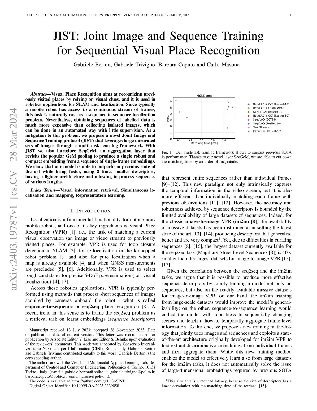Visual Place Recognition aims at recognizing previously visited places by relying on visual clues, and it is used in robotics applications for SLAM and localization. Since typically a mobile robot has access to a continuous stream of frames, this task is naturally cast as a sequence-to-sequence localization problem. Nevertheless, obtaining sequences of labelled data is much more expensive than collecting isolated images, which can be done in an automated way with little supervision. As a mitigation to this problem, we propose a novel Joint Image and Sequence Training protocol (JIST) that leverages large uncurated sets of images through a multi-task learning framework. With JIST we also introduce SeqGeM, an aggregation layer that revisits the popular GeM pooling to produce a single robust and compact embedding from a sequence of single-frame embeddings. We show that our model is able to outperform previous state of the art while being faster, using 8 times smaller descriptors, having a lighter architecture and allowing to process sequences of various lengths. Code is available at https://github.com/ga1i13o/JIST