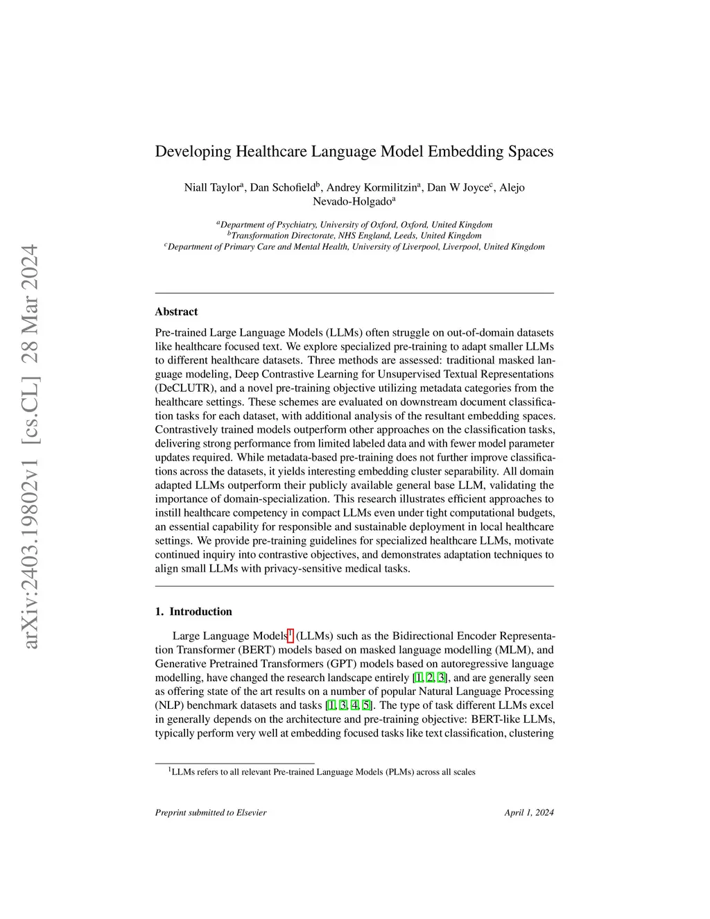 Pre-trained Large Language Models (LLMs) often struggle on out-of-domain datasets like healthcare focused text. We explore specialized pre-training to adapt smaller LLMs to different healthcare datasets. Three methods are assessed: traditional masked language modeling, Deep Contrastive Learning for Unsupervised Textual Representations (DeCLUTR), and a novel pre-training objective utilizing metadata categories from the healthcare settings. These schemes are evaluated on downstream document classification tasks for each dataset, with additional analysis of the resultant embedding spaces. Contrastively trained models outperform other approaches on the classification tasks, delivering strong performance from limited labeled data and with fewer model parameter updates required. While metadata-based pre-training does not further improve classifications across the datasets, it yields interesting embedding cluster separability. All domain adapted LLMs outperform their publicly available general base LLM, validating the importance of domain-specialization. This research illustrates efficient approaches to instill healthcare competency in compact LLMs even under tight computational budgets, an essential capability for responsible and sustainable deployment in local healthcare settings. We provide pre-training guidelines for specialized healthcare LLMs, motivate continued inquiry into contrastive objectives, and demonstrates adaptation techniques to align small LLMs with privacy-sensitive medical tasks.