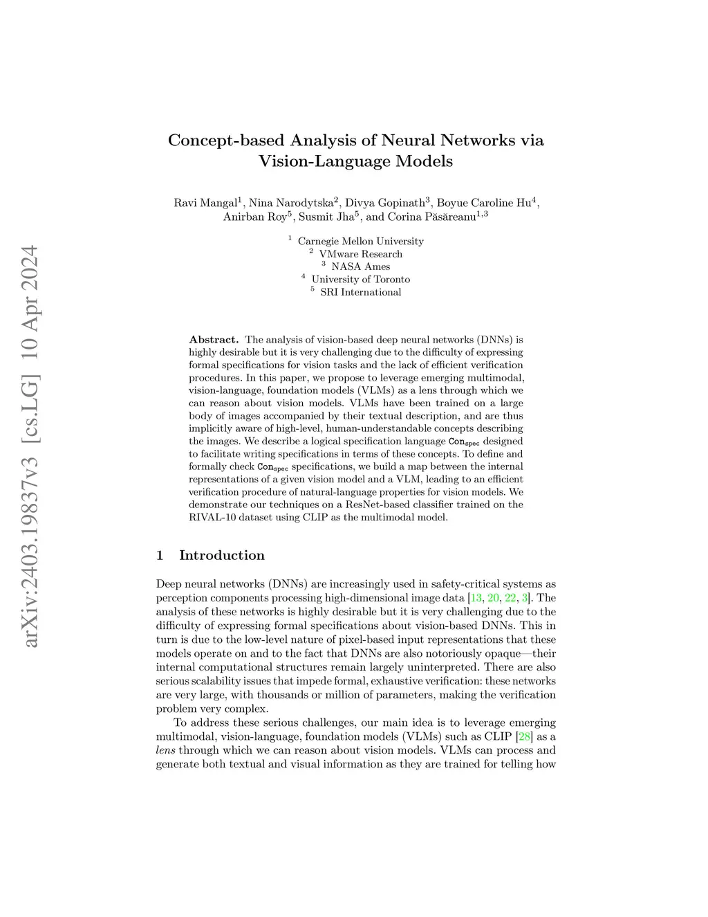 The analysis of vision-based deep neural networks (DNNs) is highly desirable but it is very challenging due to the difficulty of expressing formal specifications for vision tasks and the lack of efficient verification procedures. In this paper, we propose to leverage emerging multimodal, vision-language, foundation models (VLMs) as a lens through which we can reason about vision models. VLMs have been trained on a large body of images accompanied by their textual description, and are thus implicitly aware of high-level, human-understandable concepts describing the images. We describe a logical specification language designed to facilitate writing specifications in terms of these concepts. To define and formally check specifications, we build a map between the internal representations of a given vision model and a VLM, leading to an efficient verification procedure of natural-language properties for vision models. We demonstrate our techniques on a ResNet-based classifier trained on the RIVAL-10 dataset using CLIP as the multimodal model.