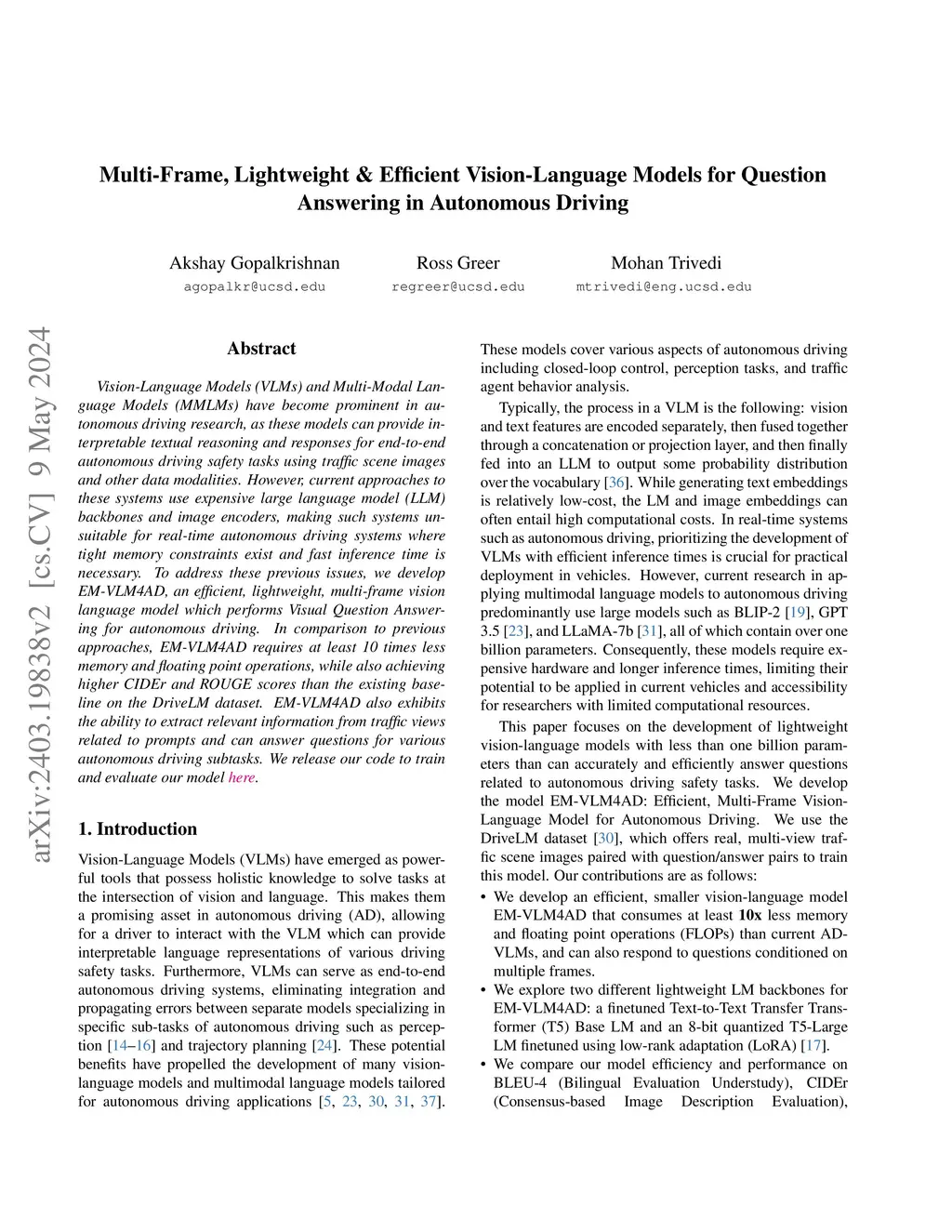Vision-Language Models (VLMs) and Multi-Modal Language models (MMLMs) have become prominent in autonomous driving research, as these models can provide interpretable textual reasoning and responses for end-to-end autonomous driving safety tasks using traffic scene images and other data modalities. However, current approaches to these systems use expensive large language model (LLM) backbones and image encoders, making such systems unsuitable for real-time autonomous driving systems where tight memory constraints exist and fast inference time is necessary. To address these previous issues, we develop EM-VLM4AD, an efficient, lightweight, multi-frame vision language model which performs Visual Question Answering for autonomous driving. In comparison to previous approaches, EM-VLM4AD requires at least 10 times less memory and floating point operations, while also achieving higher CIDEr and ROUGE-L scores than the existing baseline on the DriveLM dataset. EM-VLM4AD also exhibits the ability to extract relevant information from traffic views related to prompts and can answer questions for various autonomous driving subtasks. We release our code to train and evaluate our model at https://github.com/akshaygopalkr/EM-VLM4AD.