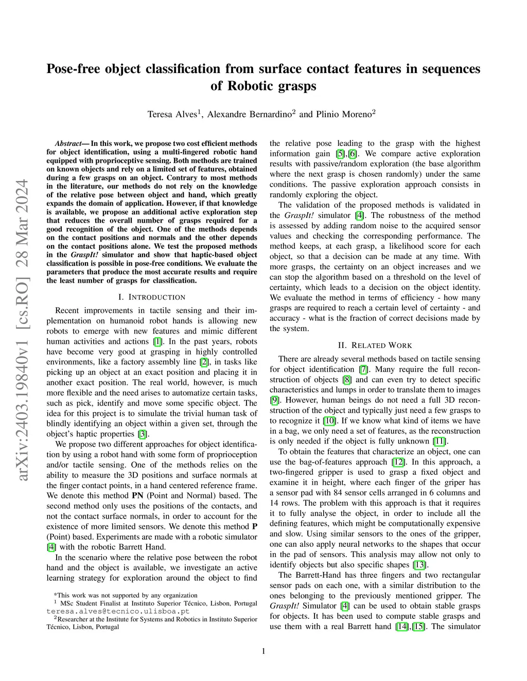 In this work, we propose two cost efficient methods for object identification, using a multi-fingered robotic hand equipped with proprioceptive sensing. Both methods are trained on known objects and rely on a limited set of features, obtained during a few grasps on an object. Contrary to most methods in the literature, our methods do not rely on the knowledge of the relative pose between object and hand, which greatly expands the domain of application. However, if that knowledge is available, we propose an additional active exploration step that reduces the overall number of grasps required for a good recognition of the object. One of the methods depends on the contact positions and normals and the other depends on the contact positions alone. We test the proposed methods in the GraspIt! simulator and show that haptic-based object classification is possible in pose-free conditions. We evaluate the parameters that produce the most accurate results and require the least number of grasps for classification.