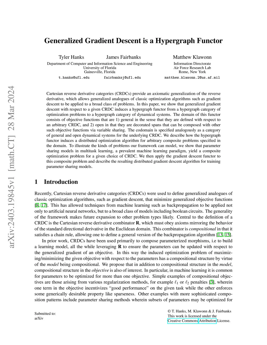 Cartesian reverse derivative categories (CRDCs) provide an axiomatic generalization of the reverse derivative, which allows generalized analogues of classic optimization algorithms such as gradient descent to be applied to a broad class of problems. In this paper, we show that generalized gradient descent with respect to a given CRDC induces a hypergraph functor from a hypergraph category of optimization problems to a hypergraph category of dynamical systems. The domain of this functor consists of objective functions that are 1) general in the sense that they are defined with respect to an arbitrary CRDC, and 2) open in that they are decorated spans that can be composed with other such objective functions via variable sharing. The codomain is specified analogously as a category of general and open dynamical systems for the underlying CRDC. We describe how the hypergraph functor induces a distributed optimization algorithm for arbitrary composite problems specified in the domain. To illustrate the kinds of problems our framework can model, we show that parameter sharing models in multitask learning, a prevalent machine learning paradigm, yield a composite optimization problem for a given choice of CRDC. We then apply the gradient descent functor to this composite problem and describe the resulting distributed gradient descent algorithm for training parameter sharing models.