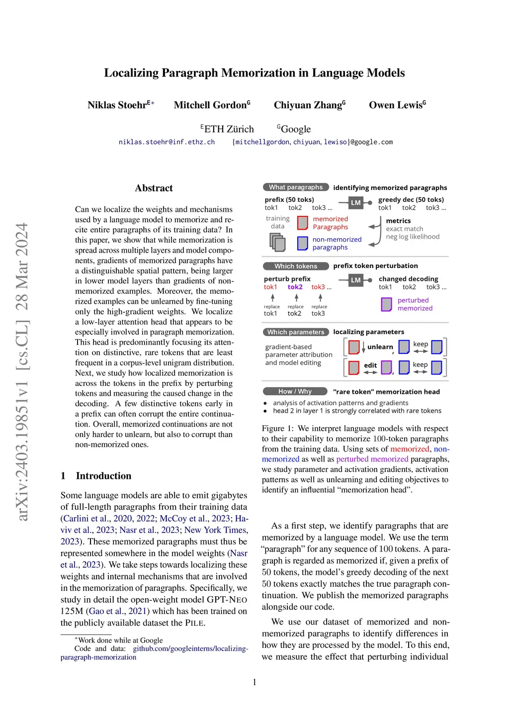Can we localize the weights and mechanisms used by a language model to memorize and recite entire paragraphs of its training data? In this paper, we show that while memorization is spread across multiple layers and model components, gradients of memorized paragraphs have a distinguishable spatial pattern, being larger in lower model layers than gradients of non-memorized examples. Moreover, the memorized examples can be unlearned by fine-tuning only the high-gradient weights. We localize a low-layer attention head that appears to be especially involved in paragraph memorization. This head is predominantly focusing its attention on distinctive, rare tokens that are least frequent in a corpus-level unigram distribution. Next, we study how localized memorization is across the tokens in the prefix by perturbing tokens and measuring the caused change in the decoding. A few distinctive tokens early in a prefix can often corrupt the entire continuation. Overall, memorized continuations are not only harder to unlearn, but also to corrupt than non-memorized ones.