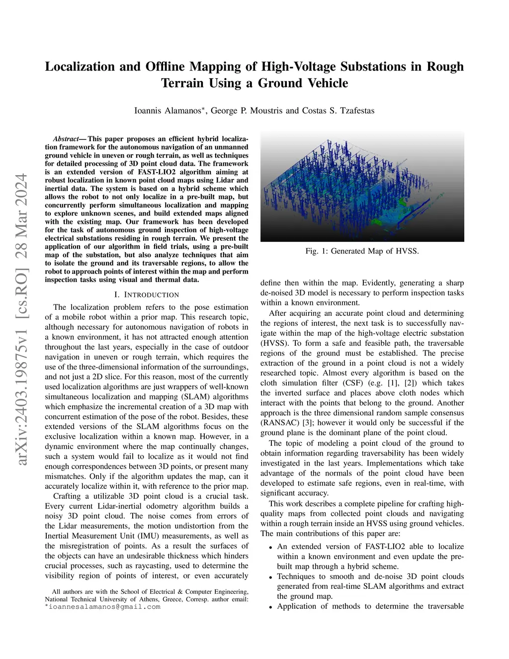 This paper proposes an efficient hybrid localization framework for the autonomous navigation of an unmanned ground vehicle in uneven or rough terrain, as well as techniques for detailed processing of 3D point cloud data. The framework is an extended version of FAST-LIO2 algorithm aiming at robust localization in known point cloud maps using Lidar and inertial data. The system is based on a hybrid scheme which allows the robot to not only localize in a pre-built map, but concurrently perform simultaneous localization and mapping to explore unknown scenes, and build extended maps aligned with the existing map. Our framework has been developed for the task of autonomous ground inspection of high-voltage electrical substations residing in rough terrain. We present the application of our algorithm in field trials, using a pre-built map of the substation, but also analyze techniques that aim to isolate the ground and its traversable regions, to allow the robot to approach points of interest within the map and perform inspection tasks using visual and thermal data.