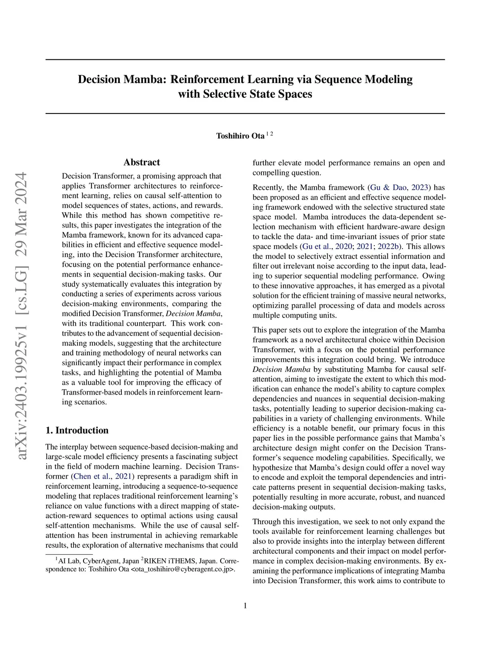 Decision Transformer, a promising approach that applies Transformer architectures to reinforcement learning, relies on causal self-attention to model sequences of states, actions, and rewards. While this method has shown competitive results, this paper investigates the integration of the Mamba framework, known for its advanced capabilities in efficient and effective sequence modeling, into the Decision Transformer architecture, focusing on the potential performance enhancements in sequential decision-making tasks. Our study systematically evaluates this integration by conducting a series of experiments across various decision-making environments, comparing the modified Decision Transformer, Decision Mamba, with its traditional counterpart. This work contributes to the advancement of sequential decision-making models, suggesting that the architecture and training methodology of neural networks can significantly impact their performance in complex tasks, and highlighting the potential of Mamba as a valuable tool for improving the efficacy of Transformer-based models in reinforcement learning scenarios.