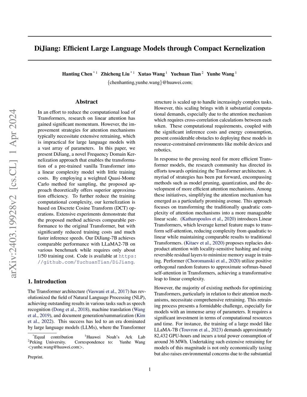 DiJiang: Efficient Large Language Models through Compact Kernelization