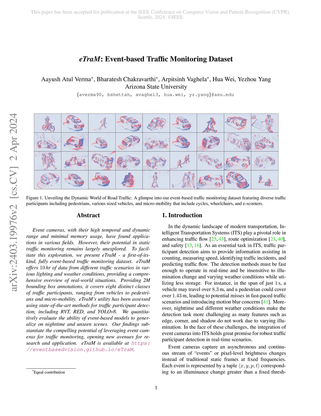 Event cameras, with their high temporal and dynamic range and minimal memory usage, have found applications in various fields. However, their potential in static traffic monitoring remains largely unexplored. To facilitate this exploration, we present eTraM - a first-of-its-kind, fully event-based traffic monitoring dataset. eTraM offers 10 hr of data from different traffic scenarios in various lighting and weather conditions, providing a comprehensive overview of real-world situations. Providing 2M bounding box annotations, it covers eight distinct classes of traffic participants, ranging from vehicles to pedestrians and micro-mobility. eTraM's utility has been assessed using state-of-the-art methods for traffic participant detection, including RVT, RED, and YOLOv8. We quantitatively evaluate the ability of event-based models to generalize on nighttime and unseen scenes. Our findings substantiate the compelling potential of leveraging event cameras for traffic monitoring, opening new avenues for research and application. eTraM is available at https://eventbasedvision.github.io/eTraM