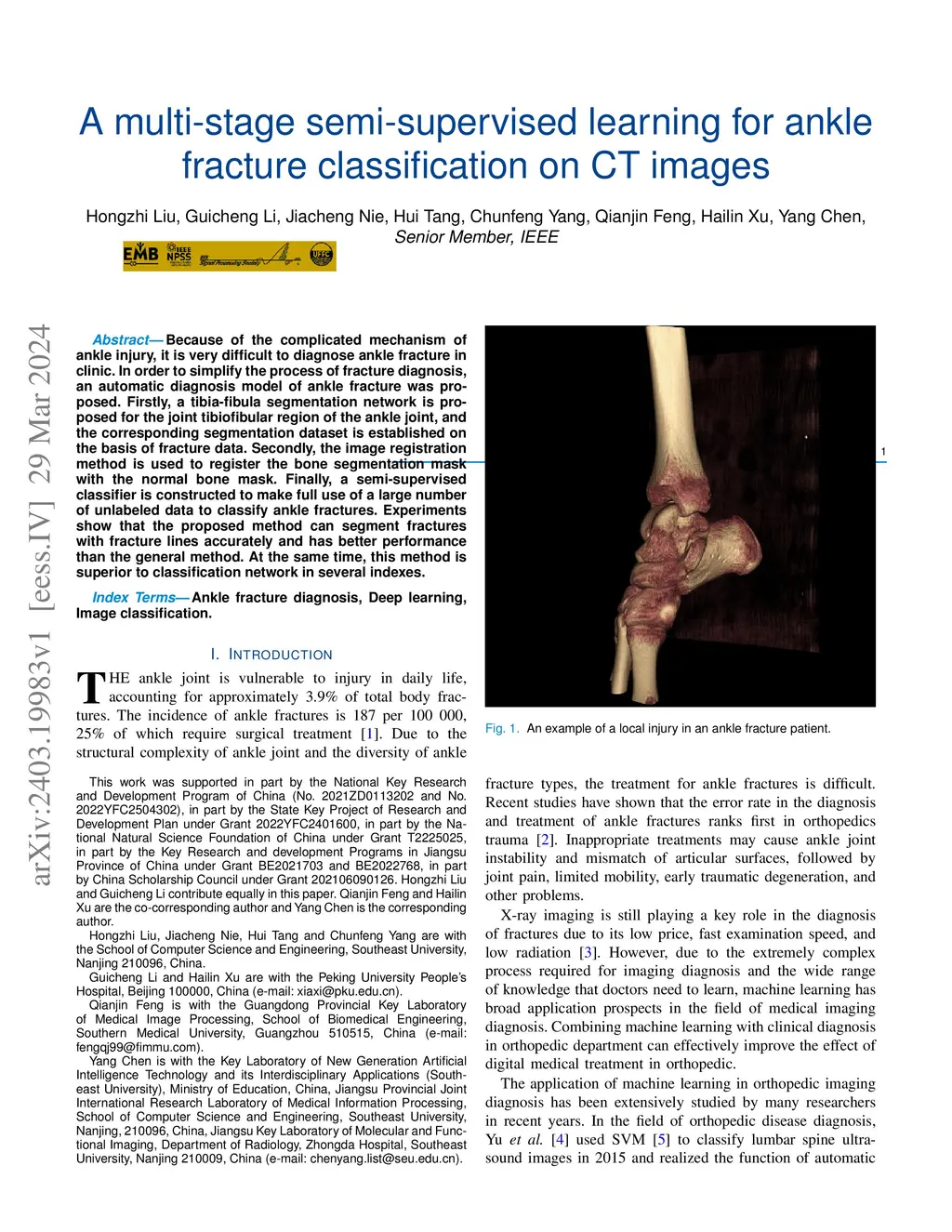 Because of the complicated mechanism of ankle injury, it is very difficult to diagnose ankle fracture in clinic. In order to simplify the process of fracture diagnosis, an automatic diagnosis model of ankle fracture was proposed. Firstly, a tibia-fibula segmentation network is proposed for the joint tibiofibular region of the ankle joint, and the corresponding segmentation dataset is established on the basis of fracture data. Secondly, the image registration method is used to register the bone segmentation mask with the normal bone mask. Finally, a semi-supervised classifier is constructed to make full use of a large number of unlabeled data to classify ankle fractures. Experiments show that the proposed method can segment fractures with fracture lines accurately and has better performance than the general method. At the same time, this method is superior to classification network in several indexes.