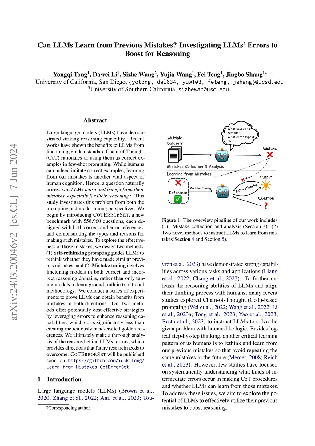 Recent works have shown the benefits to LLMs from fine-tuning golden-standard Chain-of-Thought (CoT) rationales or using them as correct examples in few-shot prompting. While humans can indeed imitate correct examples, learning from our mistakes is another vital aspect of human cognition. Hence, a question naturally arises: \textit{can LLMs learn and benefit from their mistakes, especially for their reasoning? } This study investigates this problem from both the prompting and model-tuning perspectives. We begin by introducing \textsc{CoTErrorSet}, a new benchmark with 609,432 questions, each designed with both correct and error references, and demonstrating the types and reasons for making such mistakes. To explore the effectiveness of those mistakes, we design two methods: (1) \textbf{Self-rethinking} prompting guides LLMs to rethink whether they have made similar previous mistakes; and (2) \textbf{Mistake tuning} involves finetuning models in both correct and incorrect reasoning domains, rather than only tuning models to learn ground truth in traditional methodology. We conduct a series of experiments to prove LLMs can obtain benefits from mistakes in both directions. Our two methods offer potentially cost-effective strategies by leveraging errors to enhance reasoning capabilities, which costs significantly less than creating meticulously hand-crafted golden references. We ultimately make a thorough analysis of the reasons behind LLMs' errors, which provides directions that future research needs to overcome. \textsc{CoTErrorSet} will be published soon on \texttt{\url{https://github.com/YookiTong/Learn-from-Mistakes-CotErrorSet}}.