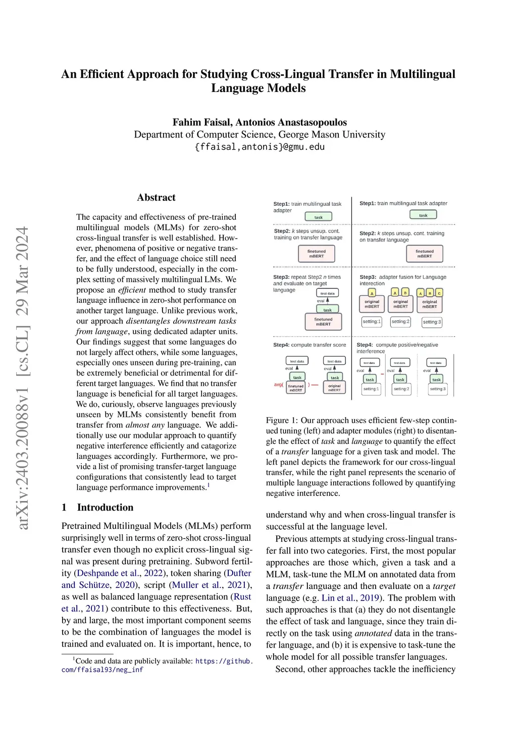 The capacity and effectiveness of pre-trained multilingual models (MLMs) for zero-shot cross-lingual transfer is well established. However, phenomena of positive or negative transfer, and the effect of language choice still need to be fully understood, especially in the complex setting of massively multilingual LMs. We propose an \textit{efficient} method to study transfer language influence in zero-shot performance on another target language. Unlike previous work, our approach disentangles downstream tasks from language, using dedicated adapter units. Our findings suggest that some languages do not largely affect others, while some languages, especially ones unseen during pre-training, can be extremely beneficial or detrimental for different target languages. We find that no transfer language is beneficial for all target languages. We do, curiously, observe languages previously unseen by MLMs consistently benefit from transfer from almost any language. We additionally use our modular approach to quantify negative interference efficiently and categorize languages accordingly. Furthermore, we provide a list of promising transfer-target language configurations that consistently lead to target language performance improvements. Code and data are publicly available: https://github.com/ffaisal93/neg_inf
