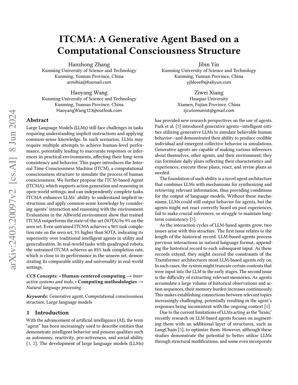 ITCMA: A Generative Agent Based on a Computational Consciousness