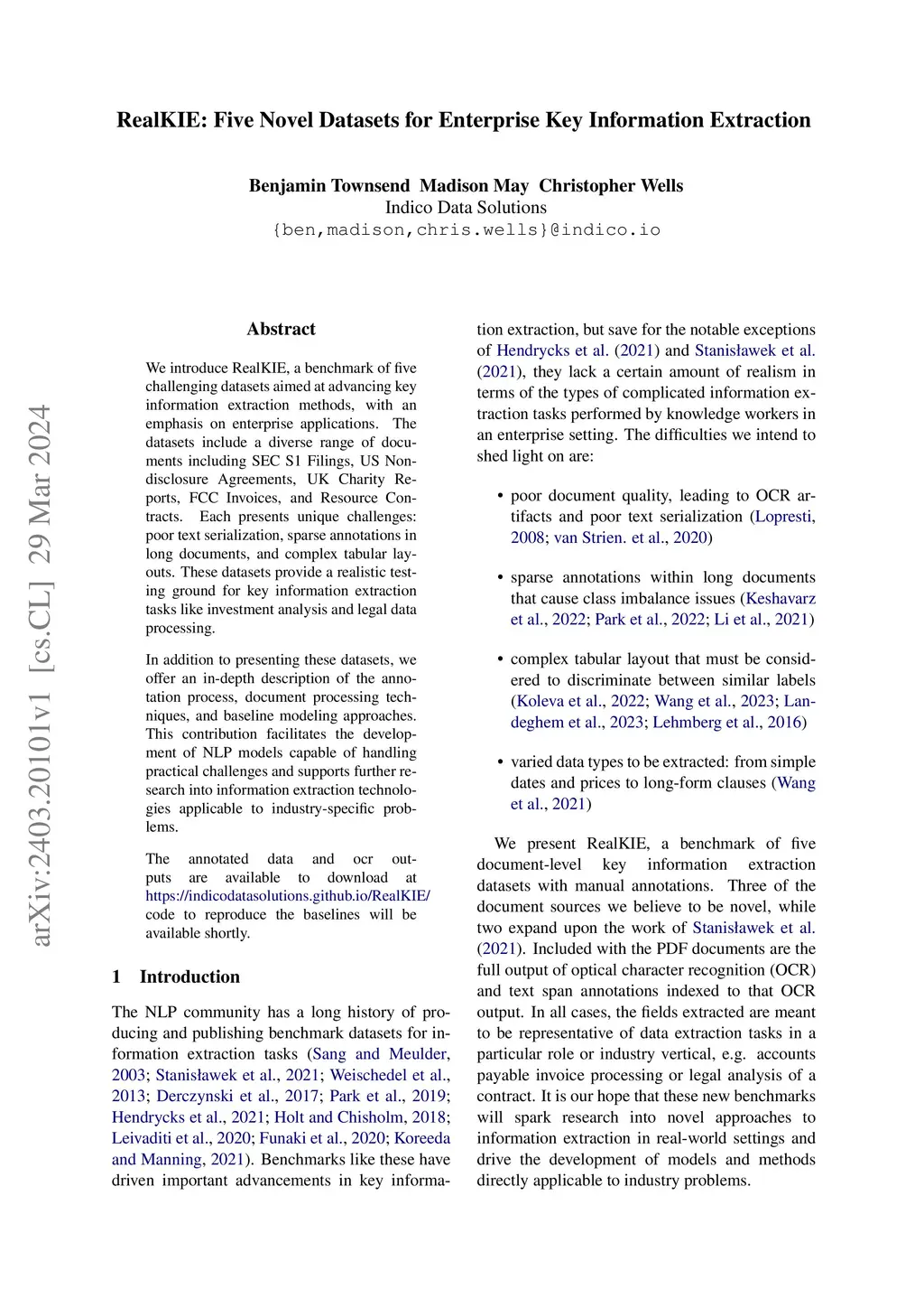We introduce RealKIE, a benchmark of five challenging datasets aimed at advancing key information extraction methods, with an emphasis on enterprise applications. The datasets include a diverse range of documents including SEC S1 Filings, US Non-disclosure Agreements, UK Charity Reports, FCC Invoices, and Resource Contracts. Each presents unique challenges: poor text serialization, sparse annotations in long documents, and complex tabular layouts. These datasets provide a realistic testing ground for key information extraction tasks like investment analysis and contract analysis. In addition to presenting these datasets, we offer an in-depth description of the annotation process, document processing techniques, and baseline modeling approaches. This contribution facilitates the development of NLP models capable of handling practical challenges and supports further research into information extraction technologies applicable to industry-specific problems. The annotated data, OCR outputs, and code to reproduce baselines are available to download atthis https URL.