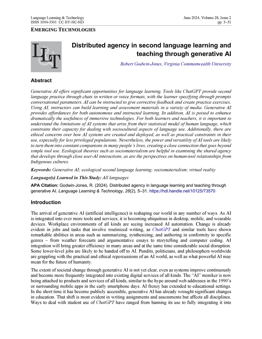 Generative AI offers significant opportunities for language learning. Tools like ChatGPT can provide informal second language practice through chats in written or voice forms, with the learner specifying through prompts conversational parameters such as proficiency level, language register, and discussion topics. AI can be instructed to give corrective feedback, create practice exercises, or develop an extended study plan. Instructors can use AI to build learning and assessment materials in a variety of media. AI is likely to make immersive technologies more powerful and versatile, moving away from scripted interactions. For both learners and teachers, it is important to understand the limitations of AI systems that arise from their purely statistical model of human language, which limits their ability to deal with nuanced social and cultural aspects of language use. Additionally, there are ethical concerns over how AI systems are created as well as practical constraints in their use, especially for less privileged populations. The power and versatility of AI tools are likely to turn them into valuable and constant companions in many peoples lives (akin to smartphones), creating a close connection that goes beyond simple tool use. Ecological theories such as sociomaterialism are helpful in examining the shared agency that develops through close user-AI interactions, as are the perspectives on human-object relations from Indigenous cultures.