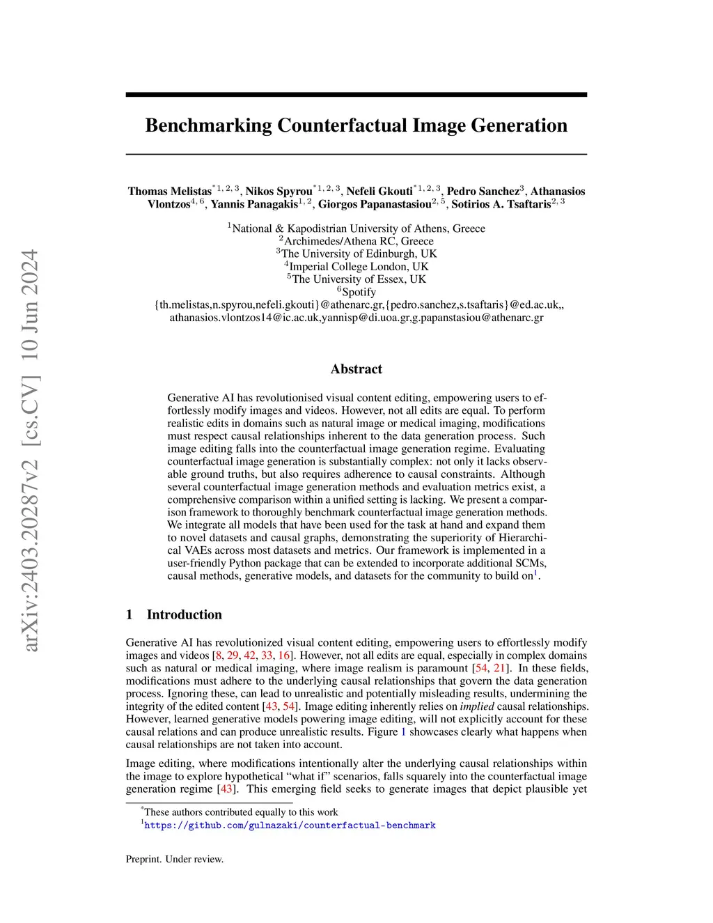 Generative AI has revolutionised visual content editing, empowering users to effortlessly modify images and videos. However, not all edits are equal. To perform realistic edits in domains such as natural image or medical imaging, modifications must respect causal relationships inherent to the data generation process. Such image editing falls into the counterfactual image generation regime. Evaluating counterfactual image generation is substantially complex: not only it lacks observable ground truths, but also requires adherence to causal constraints. Although several counterfactual image generation methods and evaluation metrics exist, a comprehensive comparison within a unified setting is lacking. We present a comparison framework to thoroughly benchmark counterfactual image generation methods. We integrate all models that have been used for the task at hand and expand them to novel datasets and causal graphs, demonstrating the superiority of Hierarchical VAEs across most datasets and metrics. Our framework is implemented in a user-friendly Python package that can be extended to incorporate additional SCMs, causal methods, generative models, and datasets for the community to build on. Code:this https URL.