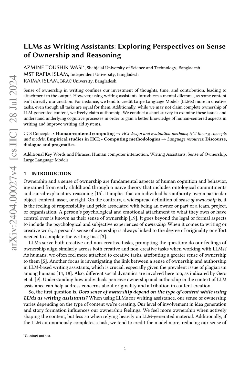 Sense of ownership in writing confines our investment of thoughts, time, and contribution, leading to attachment to the output. However, using writing assistants introduces a mental dilemma, as some content isn't directly our creation. For instance, we tend to credit Large Language Models (LLMs) more in creative tasks, even though all tasks are equal for them. Additionally, while we may not claim complete ownership of LLM-generated content, we freely claim authorship. We conduct a short survey to examine these issues and understand underlying cognitive processes in order to gain a better knowledge of human-computer interaction in writing and improve writing aid systems.
