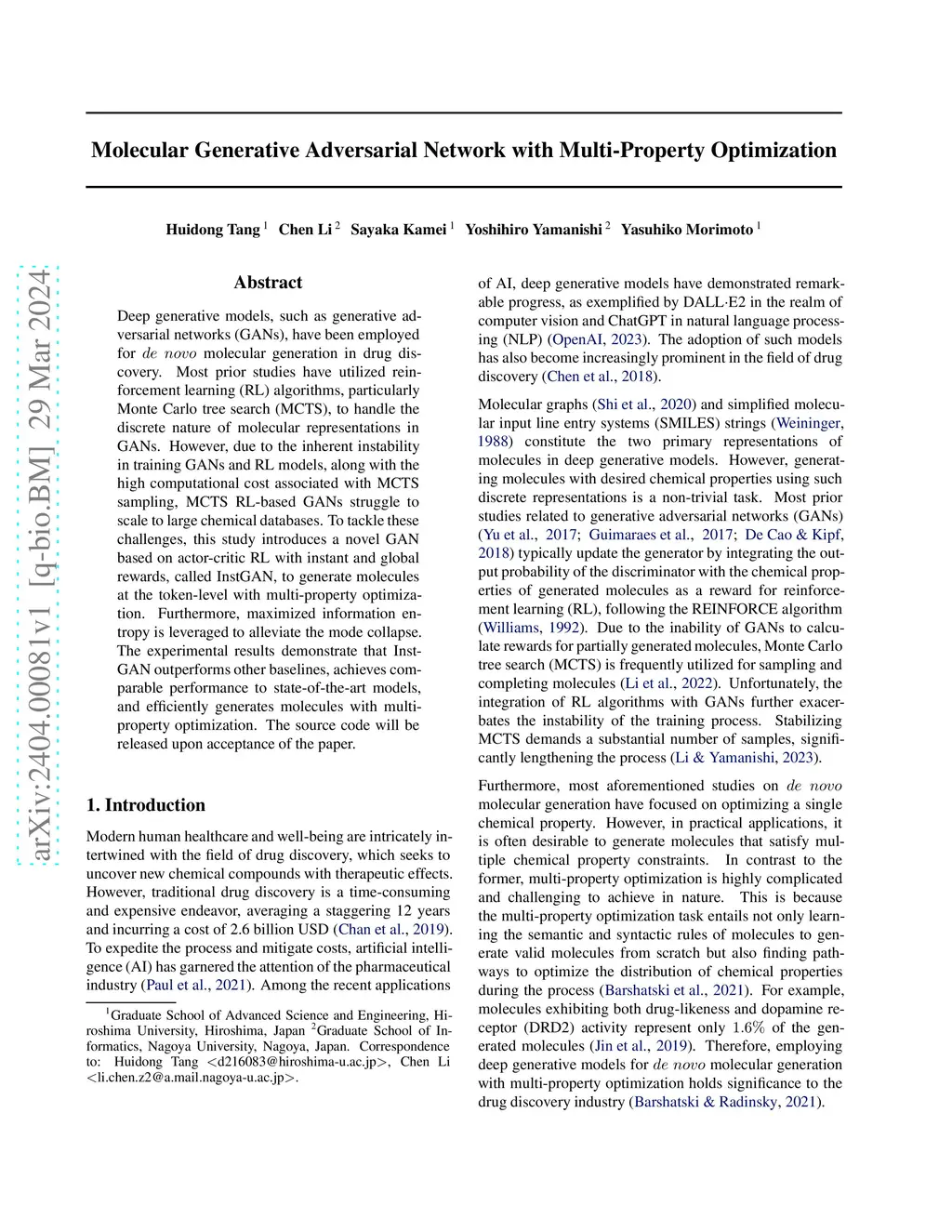 Deep generative models, such as generative adversarial networks (GANs), have been employed for molecular generation in drug discovery. Most prior studies have utilized reinforcement learning (RL) algorithms, particularly Monte Carlo tree search (MCTS), to handle the discrete nature of molecular representations in GANs. However, due to the inherent instability in training GANs and RL models, along with the high computational cost associated with MCTS sampling, MCTS RL-based GANs struggle to scale to large chemical databases. To tackle these challenges, this study introduces a novel GAN based on actor-critic RL with instant and global rewards, called InstGAN, to generate molecules at the token-level with multi-property optimization. Furthermore, maximized information entropy is leveraged to alleviate the mode collapse. The experimental results demonstrate that InstGAN outperforms other baselines, achieves comparable performance to state-of-the-art models, and efficiently generates molecules with multi-property optimization. The source code will be released upon acceptance of the paper.