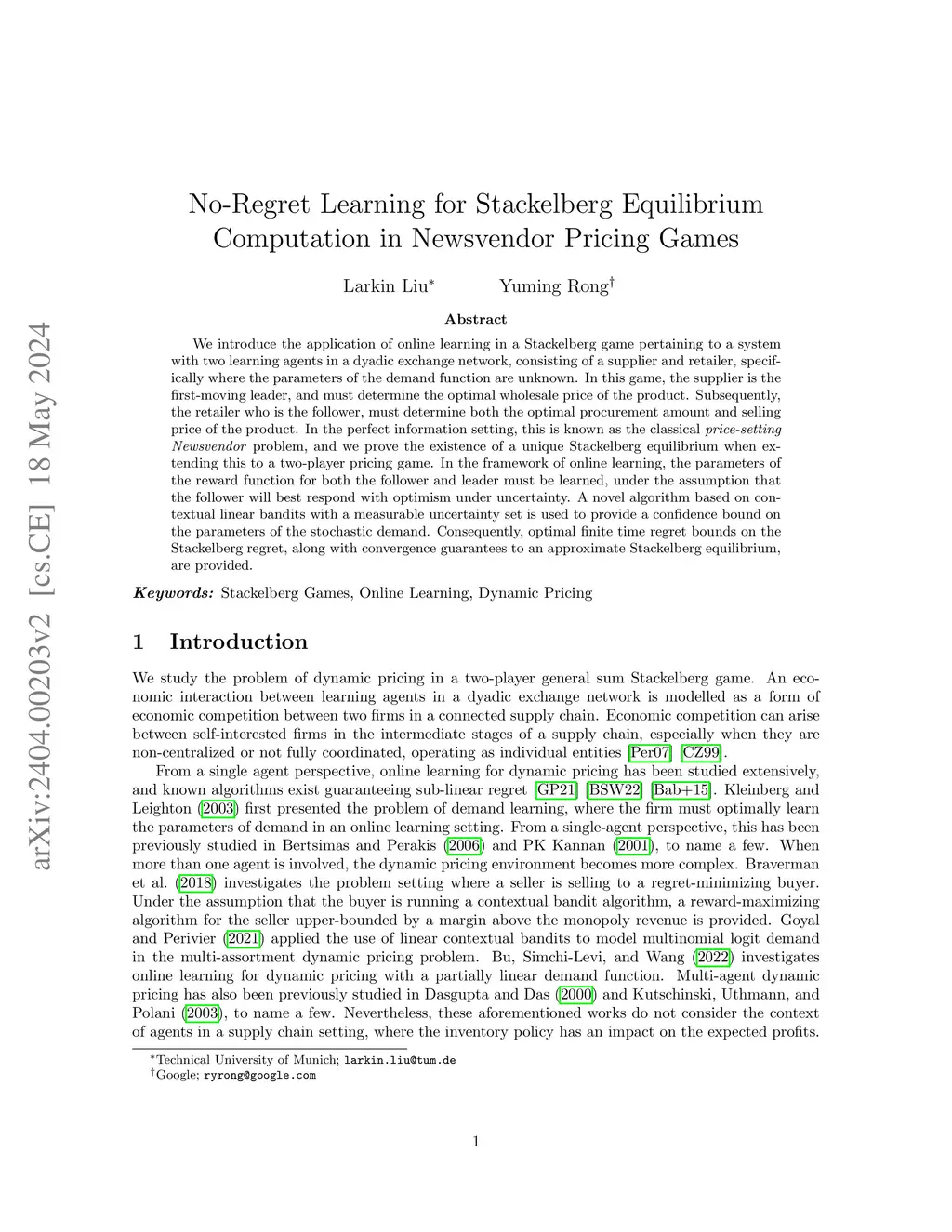 We introduce the application of online learning in a Stackelberg game pertaining to a system with two learning agents in a dyadic exchange network, consisting of a supplier and retailer, specifically where the parameters of the demand function are unknown. In this game, the supplier is the first-moving leader, and must determine the optimal wholesale price of the product. Subsequently, the retailer who is the follower, must determine both the optimal procurement amount and selling price of the product. In the perfect information setting, this is known as the classical price-setting Newsvendor problem, and we prove the existence of a unique Stackelberg equilibrium when extending this to a two-player pricing game. In the framework of online learning, the parameters of the reward function for both the follower and leader must be learned, under the assumption that the follower will best respond with optimism under uncertainty. A novel algorithm based on contextual linear bandits with a measurable uncertainty set is used to provide a confidence bound on the parameters of the stochastic demand. Consequently, optimal finite time regret bounds on the Stackelberg regret, along with convergence guarantees to an approximate Stackelberg equilibrium, are provided.