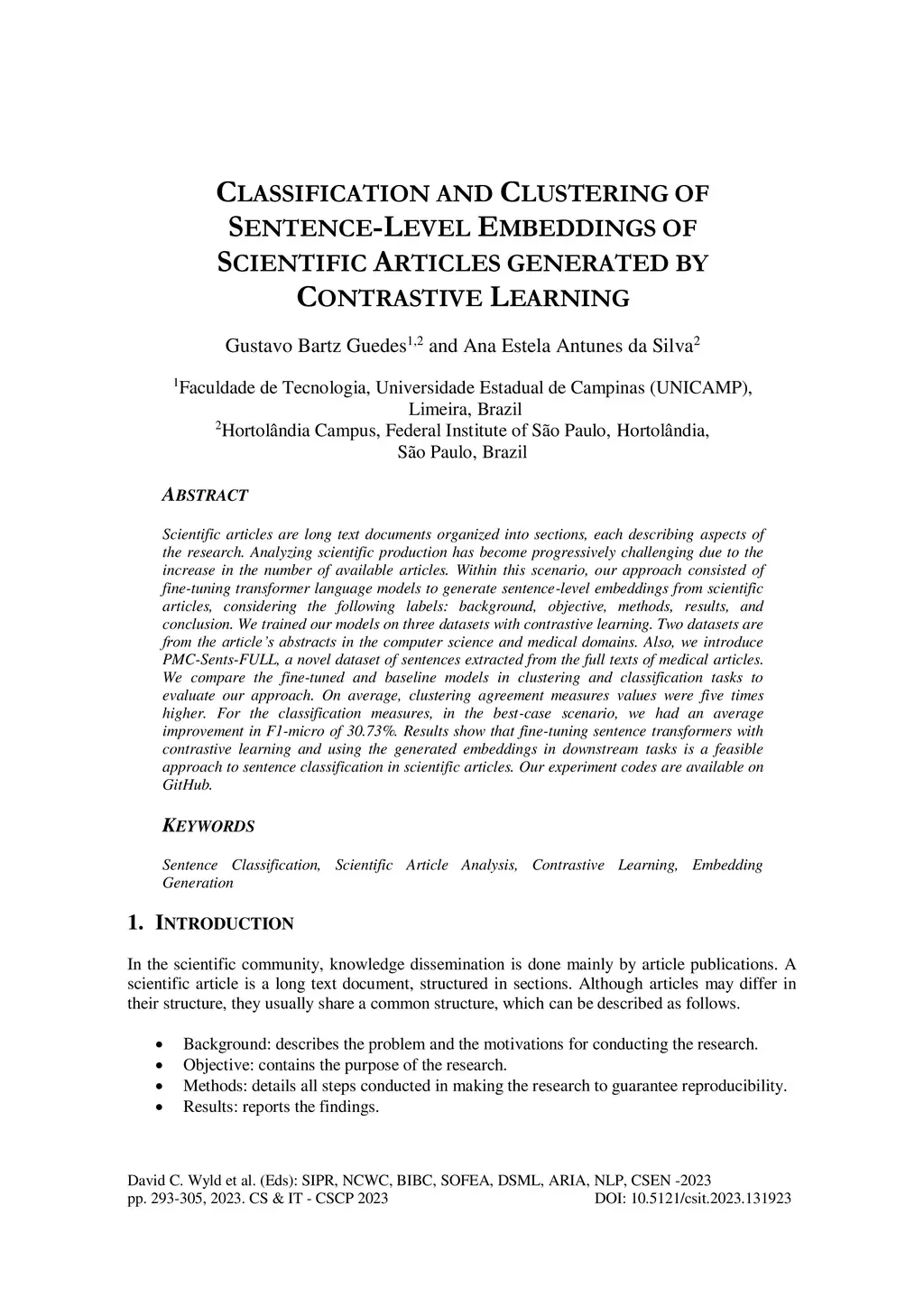 Scientific articles are long text documents organized into sections, each describing aspects of the research. Analyzing scientific production has become progressively challenging due to the increase in the number of available articles. Within this scenario, our approach consisted of fine-tuning transformer language models to generate sentence-level embeddings from scientific articles, considering the following labels: background, objective, methods, results, and conclusion. We trained our models on three datasets with contrastive learning. Two datasets are from the article's abstracts in the computer science and medical domains. Also, we introduce PMC-Sents-FULL, a novel dataset of sentences extracted from the full texts of medical articles. We compare the fine-tuned and baseline models in clustering and classification tasks to evaluate our approach. On average, clustering agreement measures values were five times higher. For the classification measures, in the best-case scenario, we had an average improvement in F1-micro of 30.73\%. Results show that fine-tuning sentence transformers with contrastive learning and using the generated embeddings in downstream tasks is a feasible approach to sentence classification in scientific articles. Our experiment codes are available on GitHub.