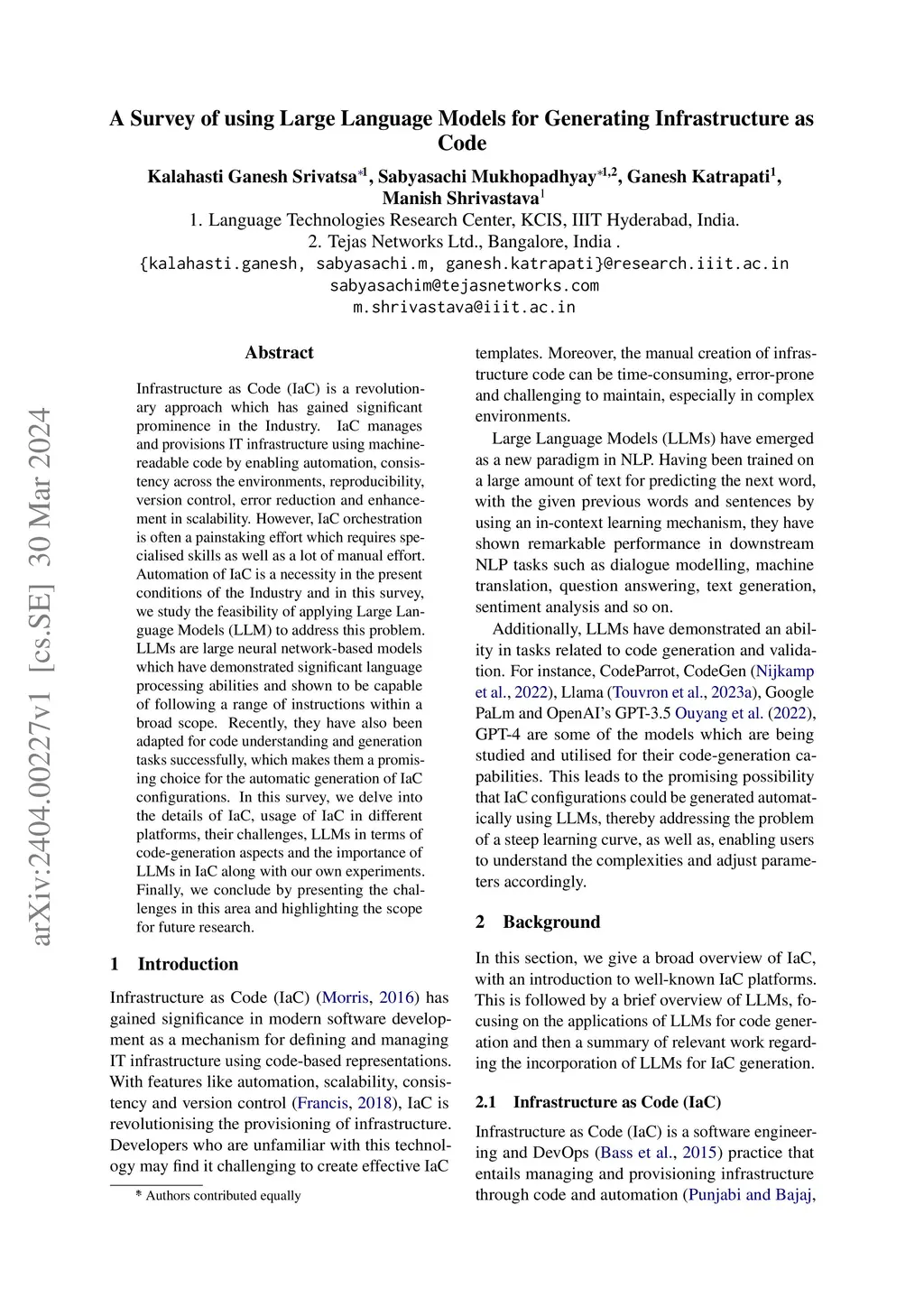 Infrastructure as Code (IaC) is a revolutionary approach which has gained significant prominence in the Industry. IaC manages and provisions IT infrastructure using machine-readable code by enabling automation, consistency across the environments, reproducibility, version control, error reduction and enhancement in scalability. However, IaC orchestration is often a painstaking effort which requires specialised skills as well as a lot of manual effort. Automation of IaC is a necessity in the present conditions of the Industry and in this survey, we study the feasibility of applying Large Language Models (LLM) to address this problem. LLMs are large neural network-based models which have demonstrated significant language processing abilities and shown to be capable of following a range of instructions within a broad scope. Recently, they have also been adapted for code understanding and generation tasks successfully, which makes them a promising choice for the automatic generation of IaC configurations. In this survey, we delve into the details of IaC, usage of IaC in different platforms, their challenges, LLMs in terms of code-generation aspects and the importance of LLMs in IaC along with our own experiments. Finally, we conclude by presenting the challenges in this area and highlighting the scope for future research.