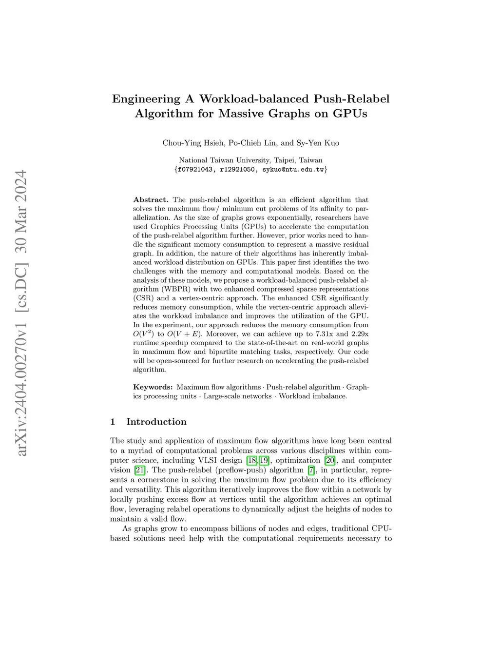 The push-relabel algorithm is an efficient algorithm that solves the maximum flow/ minimum cut problems of its affinity to parallelization. As the size of graphs grows exponentially, researchers have used Graphics Processing Units (GPUs) to accelerate the computation of the push-relabel algorithm further. However, prior works need to handle the significant memory consumption to represent a massive residual graph. In addition, the nature of their algorithms has inherently imbalanced workload distribution on GPUs. This paper first identifies the two challenges with the memory and computational models. Based on the analysis of these models, we propose a workload-balanced push-relabel algorithm (WBPR) with two enhanced compressed sparse representations (CSR) and a vertex-centric approach. The enhanced CSR significantly reduces memory consumption, while the vertex-centric approach alleviates the workload imbalance and improves the utilization of the GPU. In the experiment, our approach reduces the memory consumption from O(V^2) to O(V + E). Moreover, we can achieve up to 7.31x and 2.29x runtime speedup compared to the state-of-the-art on real-world graphs in maximum flow and bipartite matching tasks, respectively. Our code will be open-sourced for further research on accelerating the push-relabel algorithm.