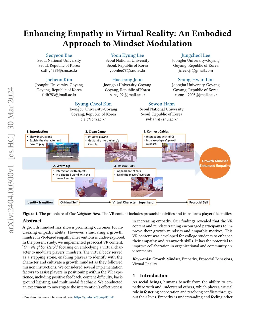 A growth mindset has shown promising outcomes for increasing empathy ability. However, stimulating a growth mindset in VR-based empathy interventions is under-explored. In the present study, we implemented prosocial VR content, Our Neighbor Hero, focusing on embodying a virtual character to modulate players' mindsets. The virtual body served as a stepping stone, enabling players to identify with the character and cultivate a growth mindset as they followed mission instructions. We considered several implementation factors to assist players in positioning within the VR experience, including positive feedback, content difficulty, background lighting, and multimodal feedback. We conducted an experiment to investigate the intervention's effectiveness in increasing empathy. Our findings revealed that the VR content and mindset training encouraged participants to improve their growth mindsets and empathic motives. This VR content was developed for college students to enhance their empathy and teamwork skills. It has the potential to improve collaboration in organizational and community environments.