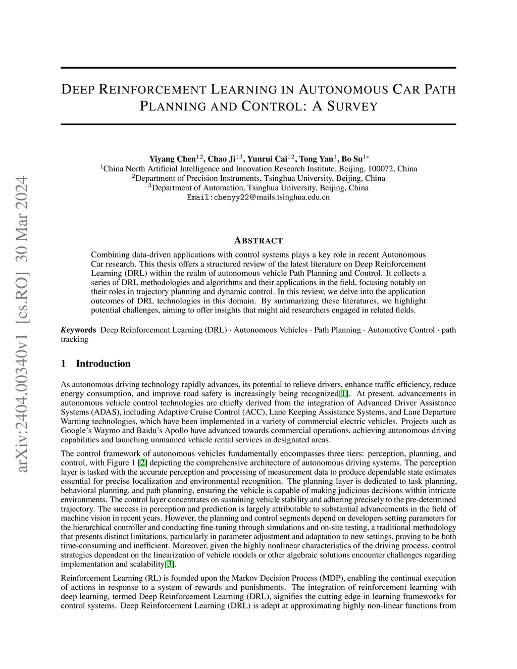 Combining data-driven applications with control systems plays a key role in recent Autonomous Car research. This thesis offers a structured review of the latest literature on Deep Reinforcement Learning (DRL) within the realm of autonomous vehicle Path Planning and Control. It collects a series of DRL methodologies and algorithms and their applications in the field, focusing notably on their roles in trajectory planning and dynamic control. In this review, we delve into the application outcomes of DRL technologies in this domain. By summarizing these literatures, we highlight potential challenges, aiming to offer insights that might aid researchers engaged in related fields.