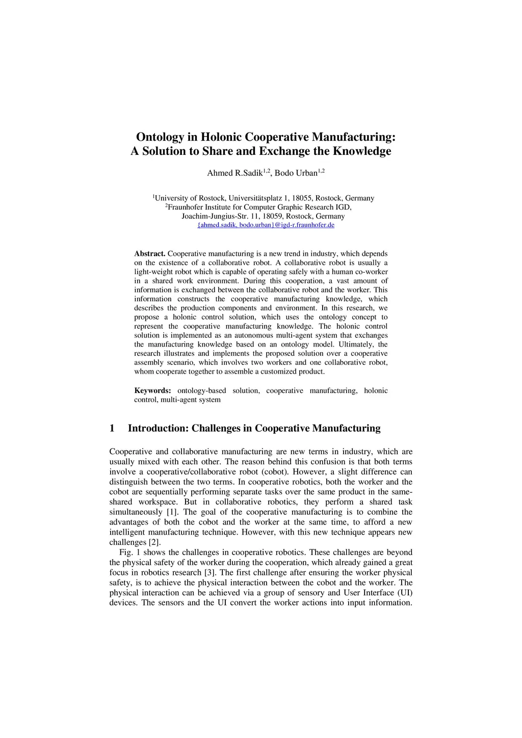 Cooperative manufacturing is a new trend in industry, which depends on the existence of a collaborative robot. A collaborative robot is usually a light-weight robot which is capable of operating safely with a human co-worker in a shared work environment. During this cooperation, a vast amount of information is exchanged between the collaborative robot and the worker. This information constructs the cooperative manufacturing knowledge, which describes the production components and environment. In this research, we propose a holonic control solution, which uses the ontology concept to represent the cooperative manufacturing knowledge. The holonic control solution is implemented as an autonomous multi-agent system that exchanges the manufacturing knowledge based on an ontology model. Ultimately, the research illustrates and implements the proposed solution over a cooperative assembly scenario, which involves two workers and one collaborative robot, whom cooperate together to assemble a customized product.
