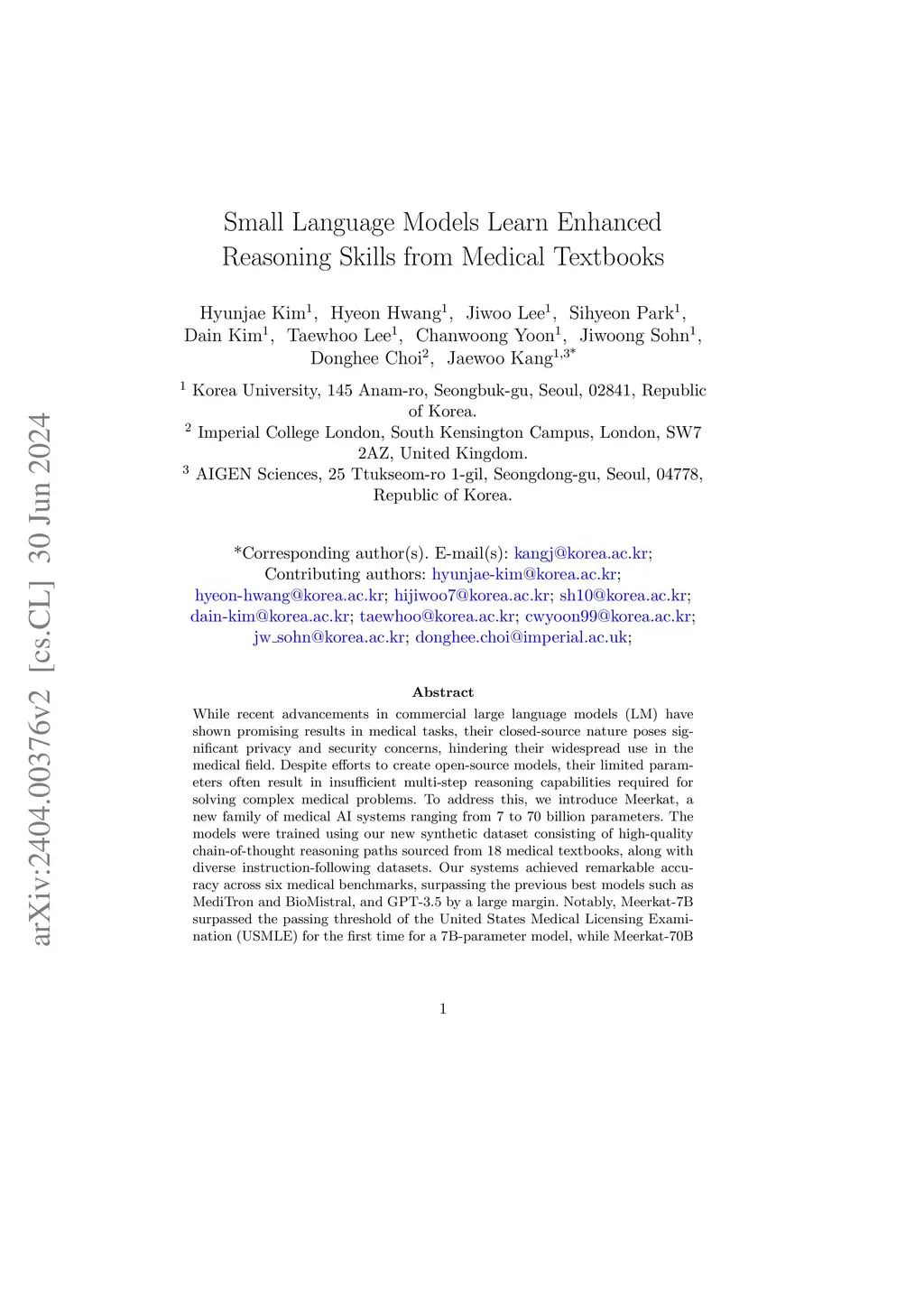 While recent advancements in commercial large language models (LM) have shown promising results in medical tasks, their closed-source nature poses significant privacy and security concerns, hindering their widespread use in the medical field. Despite efforts to create open-source models, their limited parameters often result in insufficient multi-step reasoning capabilities required for solving complex medical problems. To address this, we introduce Meerkat, a new family of medical AI systems ranging from 7 to 70 billion parameters. The models were trained using our new synthetic dataset consisting of high-quality chain-of-thought reasoning paths sourced from 18 medical textbooks, along with diverse instruction-following datasets. Our systems achieved remarkable accuracy across six medical benchmarks, surpassing the previous best models such as MediTron and BioMistral, and GPT-3.5 by a large margin. Notably, Meerkat-7B surpassed the passing threshold of the United States Medical Licensing Examination (USMLE) for the first time for a 7B-parameter model, while Meerkat-70B outperformed GPT-4 by an average of 1.3%. Additionally, Meerkat-70B correctly diagnosed 21 out of 38 complex clinical cases, outperforming humans' 13.8 and closely matching GPT-4's 21.8. Our systems offered more detailed free-form responses to clinical queries compared to existing small models, approaching the performance level of large commercial models. This significantly narrows the performance gap with large LMs, showcasing its effectiveness in addressing complex medical challenges.