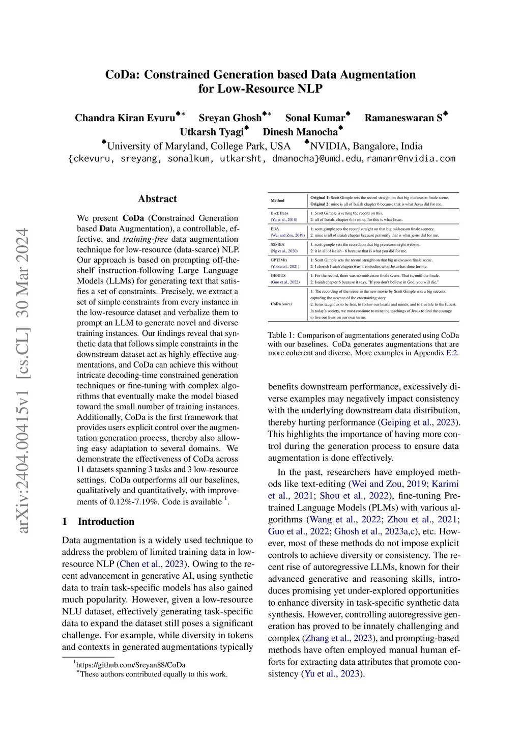 CoDa: Constrained Generation based Data Augmentation for Low-Resource