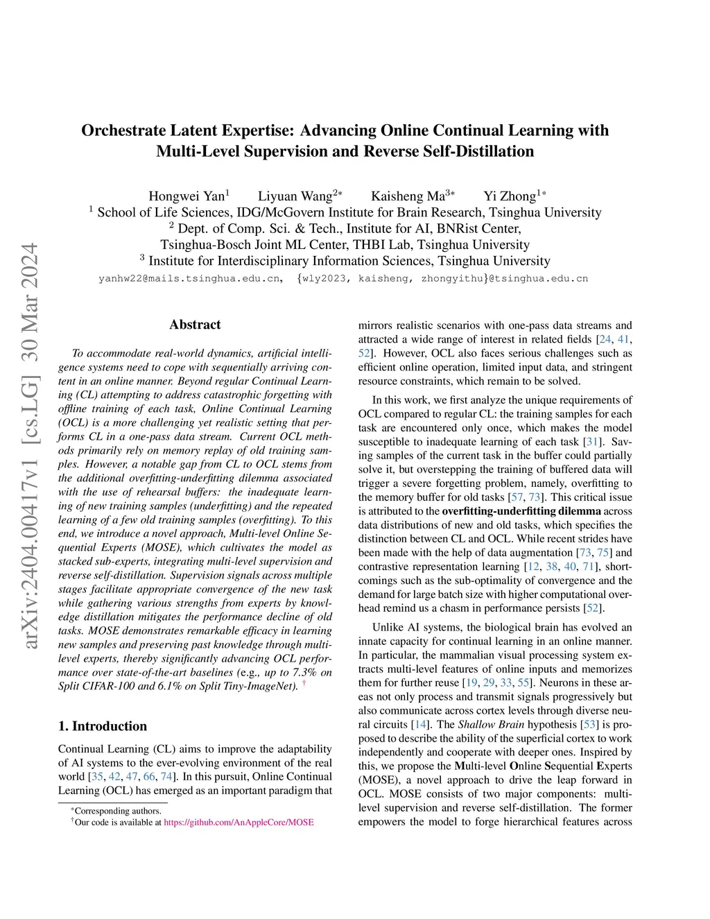 To accommodate real-world dynamics, artificial intelligence systems need to cope with sequentially arriving content in an online manner. Beyond regular Continual Learning (CL) attempting to address catastrophic forgetting with offline training of each task, Online Continual Learning (OCL) is a more challenging yet realistic setting that performs CL in a one-pass data stream. Current OCL methods primarily rely on memory replay of old training samples. However, a notable gap from CL to OCL stems from the additional overfitting-underfitting dilemma associated with the use of rehearsal buffers: the inadequate learning of new training samples (underfitting) and the repeated learning of a few old training samples (overfitting). To this end, we introduce a novel approach, Multi-level Online Sequential Experts (MOSE), which cultivates the model as stacked sub-experts, integrating multi-level supervision and reverse self-distillation. Supervision signals across multiple stages facilitate appropriate convergence of the new task while gathering various strengths from experts by knowledge distillation mitigates the performance decline of old tasks. MOSE demonstrates remarkable efficacy in learning new samples and preserving past knowledge through multi-level experts, thereby significantly advancing OCL performance over state-of-the-art baselines (e.g., up to 7.3% on Split CIFAR-100 and 6.1% on Split Tiny-ImageNet).