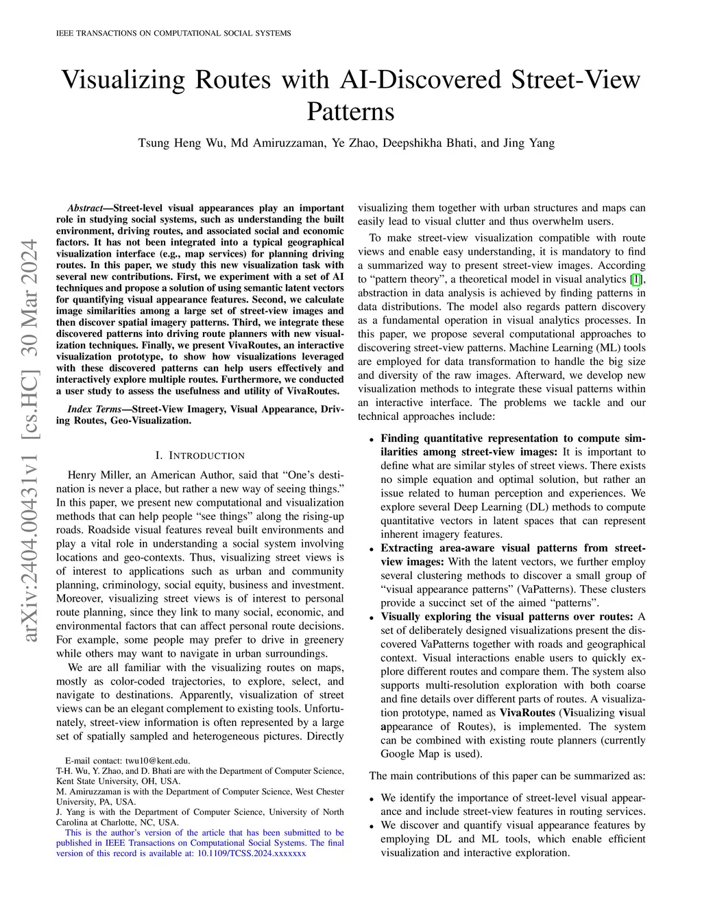 Street-level visual appearances play an important role in studying social systems, such as understanding the built environment, driving routes, and associated social and economic factors. It has not been integrated into a typical geographical visualization interface (e.g., map services) for planning driving routes. In this paper, we study this new visualization task with several new contributions. First, we experiment with a set of AI techniques and propose a solution of using semantic latent vectors for quantifying visual appearance features. Second, we calculate image similarities among a large set of street-view images and then discover spatial imagery patterns. Third, we integrate these discovered patterns into driving route planners with new visualization techniques. Finally, we present VivaRoutes, an interactive visualization prototype, to show how visualizations leveraged with these discovered patterns can help users effectively and interactively explore multiple routes. Furthermore, we conducted a user study to assess the usefulness and utility of VivaRoutes.