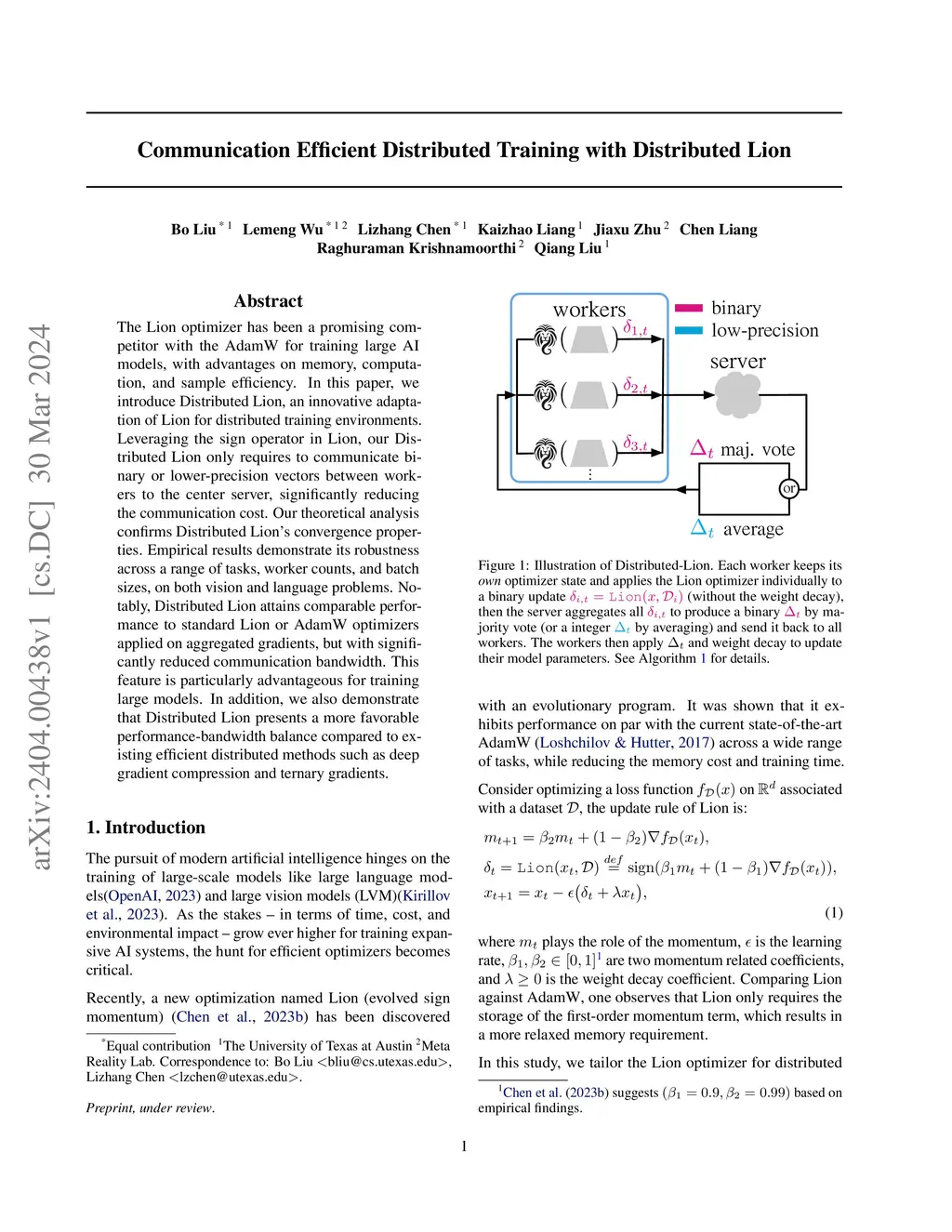 The Lion optimizer has been a promising competitor with the AdamW for training large AI models, with advantages on memory, computation, and sample efficiency. In this paper, we introduce Distributed Lion, an innovative adaptation of Lion for distributed training environments. Leveraging the sign operator in Lion, our Distributed Lion only requires communicating binary or lower-precision vectors between workers to the center server, significantly reducing the communication cost. Our theoretical analysis confirms Distributed Lion's convergence properties. Empirical results demonstrate its robustness across a range of tasks, worker counts, and batch sizes, on both vision and language problems. Notably, Distributed Lion attains comparable performance to standard Lion or AdamW optimizers applied on aggregated gradients, but with significantly reduced communication bandwidth. This feature is particularly advantageous for training large models. In addition, we also demonstrate that Distributed Lion presents a more favorable performance-bandwidth balance compared to existing efficient distributed methods such as deep gradient compression and ternary gradients.
