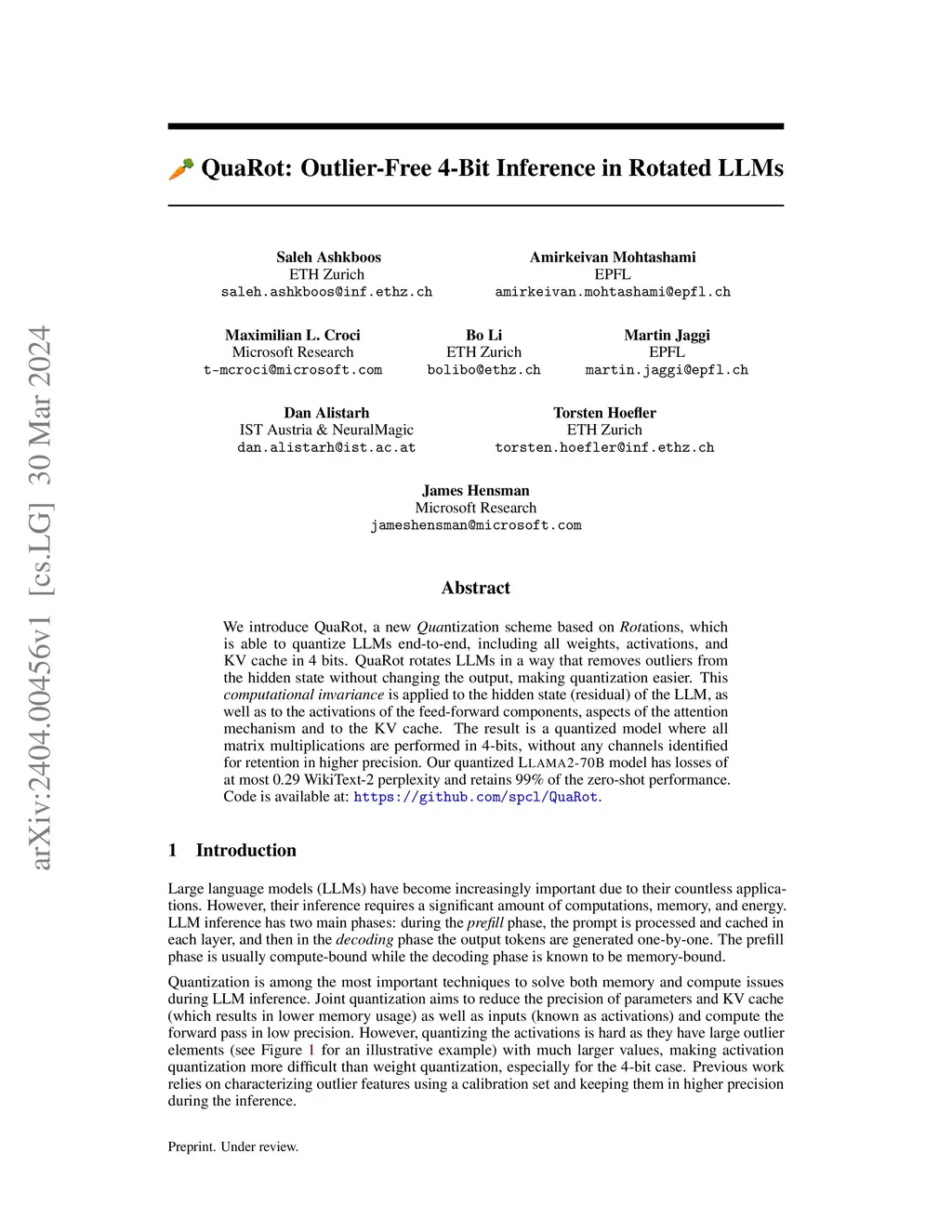 We introduce QuaRot, a new Quantization scheme based on Rotations, which is able to quantize LLMs end-to-end, including all weights, activations, and KV cache in 4 bits. QuaRot rotates LLMs in a way that removes outliers from the hidden state without changing the output, making quantization easier. This computational invariance is applied to the hidden state (residual) of the LLM, as well as to the activations of the feed-forward components, aspects of the attention mechanism and to the KV cache. The result is a quantized model where all matrix multiplications are performed in 4-bits, without any channels identified for retention in higher precision. Our quantized LLaMa2-70B model has losses of at most 0.29 WikiText-2 perplexity and retains 99% of the zero-shot performance. Code is available at: https://github.com/spcl/QuaRot.