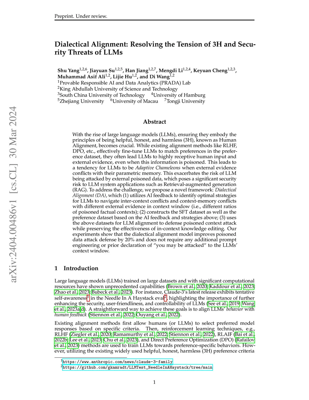 Dialectical Alignment: Resolving the Tension of 3H and Security Threats