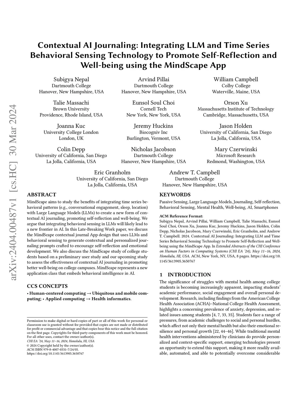 MindScape aims to study the benefits of integrating time series behavioral patterns (e.g., conversational engagement, sleep, location) with Large Language Models (LLMs) to create a new form of contextual AI journaling, promoting self-reflection and well-being. We argue that integrating behavioral sensing in LLMs will likely lead to a new frontier in AI. In this Late-Breaking Work paper, we discuss the MindScape contextual journal App design that uses LLMs and behavioral sensing to generate contextual and personalized journaling prompts crafted to encourage self-reflection and emotional development. We also discuss the MindScape study of college students based on a preliminary user study and our upcoming study to assess the effectiveness of contextual AI journaling in promoting better well-being on college campuses. MindScape represents a new application class that embeds behavioral intelligence in AI.