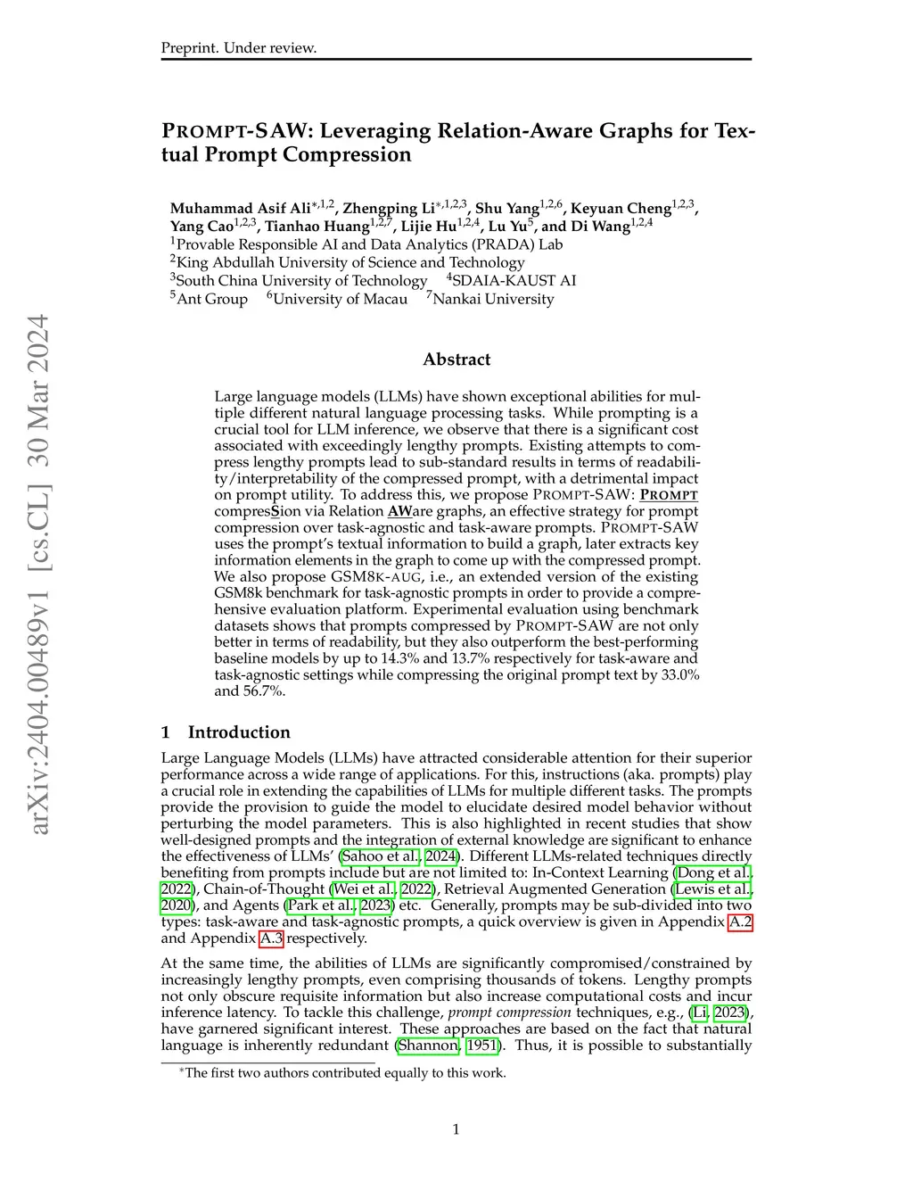 Large language models (LLMs) have shown exceptional abilities for multiple different natural language processing tasks. While prompting is a crucial tool for LLM inference, we observe that there is a significant cost associated with exceedingly lengthy prompts. Existing attempts to compress lengthy prompts lead to sub-standard results in terms of readability and interpretability of the compressed prompt, with a detrimental impact on prompt utility. To address this, we propose PROMPT-SAW: Prompt compresSion via Relation AWare graphs, an effective strategy for prompt compression over task-agnostic and task-aware prompts. PROMPT-SAW uses the prompt's textual information to build a graph, later extracts key information elements in the graph to come up with the compressed prompt. We also propose GSM8K-AUG, i.e., an extended version of the existing GSM8k benchmark for task-agnostic prompts in order to provide a comprehensive evaluation platform. Experimental evaluation using benchmark datasets shows that prompts compressed by PROMPT-SAW are not only better in terms of readability, but they also outperform the best-performing baseline models by up to 14.3 and 13.7 respectively for task-aware and task-agnostic settings while compressing the original prompt text by 33.0 and 56.7.
