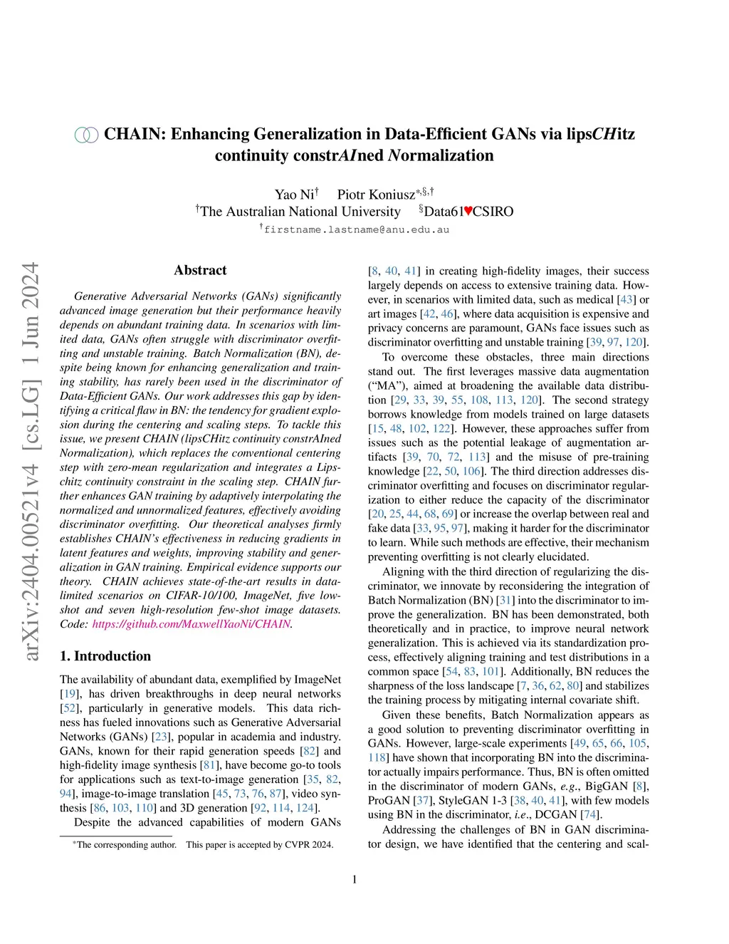 Generative Adversarial Networks (GANs) significantly advanced image generation but their performance heavily depends on abundant training data. In scenarios with limited data, GANs often struggle with discriminator overfitting and unstable training. Batch Normalization (BN), despite being known for enhancing generalization and training stability, has rarely been used in the discriminator of Data-Efficient GANs. Our work addresses this gap by identifying a critical flaw in BN: the tendency for gradient explosion during the centering and scaling steps. To tackle this issue, we present CHAIN (lipsCHitz continuity constrAIned Normalization), which replaces the conventional centering step with zero-mean regularization and integrates a Lipschitz continuity constraint in the scaling step. CHAIN further enhances GAN training by adaptively interpolating the normalized and unnormalized features, effectively avoiding discriminator overfitting. Our theoretical analyses firmly establishes CHAIN's effectiveness in reducing gradients in latent features and weights, improving stability and generalization in GAN training. Empirical evidence supports our theory. CHAIN achieves state-of-the-art results in data-limited scenarios on CIFAR-10/100, ImageNet, five low-shot and seven high-resolution few-shot image datasets. Code: https://github.com/MaxwellYaoNi/CHAIN