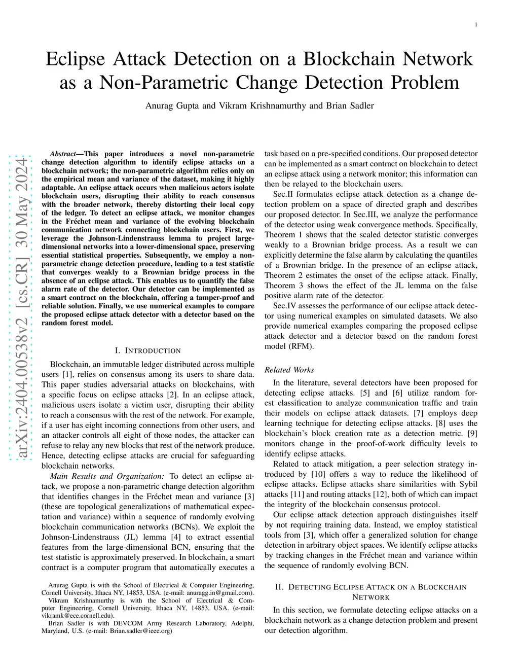 This paper introduces a novel non-parametric change detection algorithm to identify eclipse attacks on a blockchain network; the non-parametric algorithm relies only on the empirical mean and variance of the dataset, making it highly adaptable. An eclipse attack occurs when malicious actors isolate blockchain users, disrupting their ability to reach consensus with the broader network, thereby distorting their local copy of the ledger. To detect an eclipse attack, we monitor changes in the Fr\échet mean and variance of the evolving blockchain communication network connecting blockchain users. First, we leverage the Johnson-Lindenstrauss lemma to project large-dimensional networks into a lower-dimensional space, preserving essential statistical properties. Subsequently, we employ a non-parametric change detection procedure, leading to a test statistic that converges weakly to a Brownian bridge process in the absence of an eclipse attack. This enables us to quantify the false alarm rate of the detector. Our detector can be implemented as a smart contract on the blockchain, offering a tamper-proof and reliable solution. Finally, we use numerical examples to compare the proposed eclipse attack detector with a detector based on the random forest model.