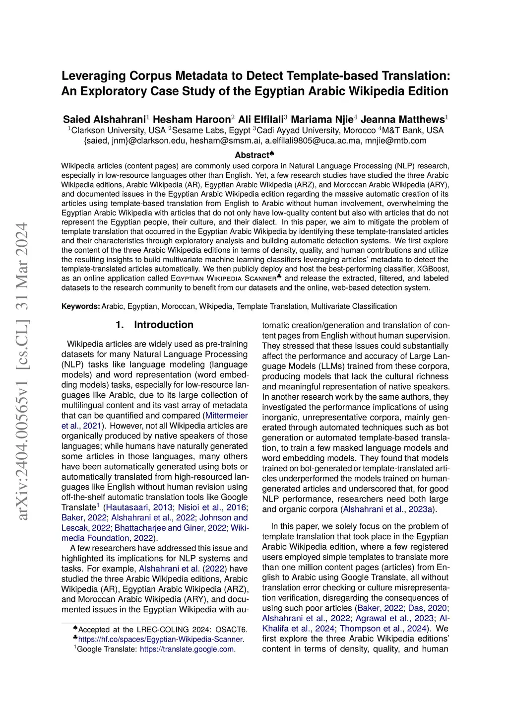 Wikipedia articles (content pages) are commonly used corpora in Natural Language Processing (NLP) research, especially in low-resource languages other than English. Yet, a few research studies have studied the three Arabic Wikipedia editions, Arabic Wikipedia (AR), Egyptian Arabic Wikipedia (ARZ), and Moroccan Arabic Wikipedia (ARY), and documented issues in the Egyptian Arabic Wikipedia edition regarding the massive automatic creation of its articles using template-based translation from English to Arabic without human involvement, overwhelming the Egyptian Arabic Wikipedia with articles that do not only have low-quality content but also with articles that do not represent the Egyptian people, their culture, and their dialect. In this paper, we aim to mitigate the problem of template translation that occurred in the Egyptian Arabic Wikipedia by identifying these template-translated articles and their characteristics through exploratory analysis and building automatic detection systems. We first explore the content of the three Arabic Wikipedia editions in terms of density, quality, and human contributions and utilize the resulting insights to build multivariate machine learning classifiers leveraging articles' metadata to detect the template-translated articles automatically. We then publicly deploy and host the best-performing classifier, XGBoost, as an online application called EGYPTIAN WIKIPEDIA SCANNER and release the extracted, filtered, and labeled datasets to the research community to benefit from our datasets and the online, web-based detection system.