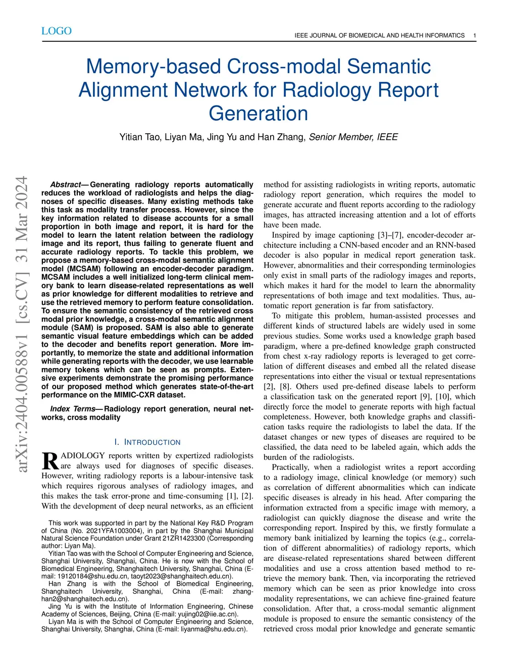Memory-based Cross-modal Semantic Alignment Network for Radiology Report