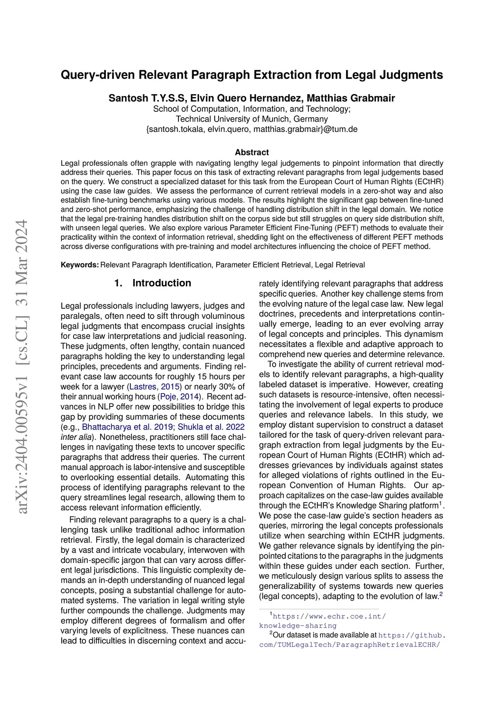 Legal professionals often grapple with navigating lengthy legal judgements to pinpoint information that directly address their queries. This paper focus on this task of extracting relevant paragraphs from legal judgements based on the query. We construct a specialized dataset for this task from the European Court of Human Rights (ECtHR) using the case law guides. We assess the performance of current retrieval models in a zero-shot way and also establish fine-tuning benchmarks using various models. The results highlight the significant gap between fine-tuned and zero-shot performance, emphasizing the challenge of handling distribution shift in the legal domain. We notice that the legal pre-training handles distribution shift on the corpus side but still struggles on query side distribution shift, with unseen legal queries. We also explore various Parameter Efficient Fine-Tuning (PEFT) methods to evaluate their practicality within the context of information retrieval, shedding light on the effectiveness of different PEFT methods across diverse configurations with pre-training and model architectures influencing the choice of PEFT method.