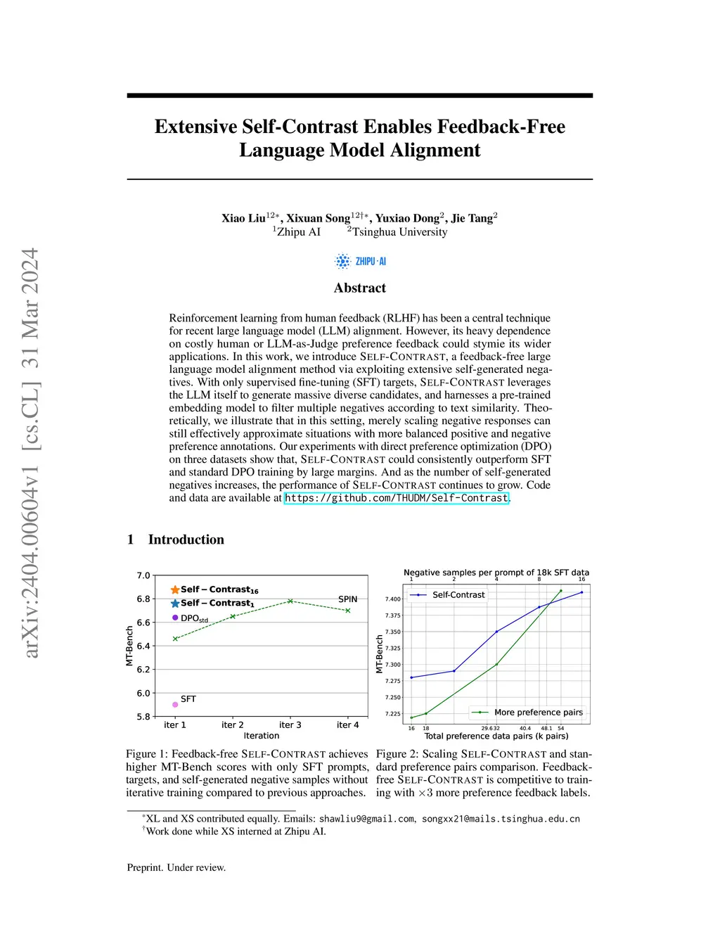 Reinforcement learning from human feedback (RLHF) has been a central technique for recent large language model (LLM) alignment. However, its heavy dependence on costly human or LLM-as-Judge preference feedback could stymie its wider applications. In this work, we introduce Self-Contrast, a feedback-free large language model alignment method via exploiting extensive self-generated negatives. With only supervised fine-tuning (SFT) targets, Self-Contrast leverages the LLM itself to generate massive diverse candidates, and harnesses a pre-trained embedding model to filter multiple negatives according to text similarity. Theoretically, we illustrate that in this setting, merely scaling negative responses can still effectively approximate situations with more balanced positive and negative preference annotations. Our experiments with direct preference optimization (DPO) on three datasets show that, Self-Contrast could consistently outperform SFT and standard DPO training by large margins. And as the number of self-generated negatives increases, the performance of Self-Contrast continues to grow. Code and data are available at https://github.com/THUDM/Self-Contrast.