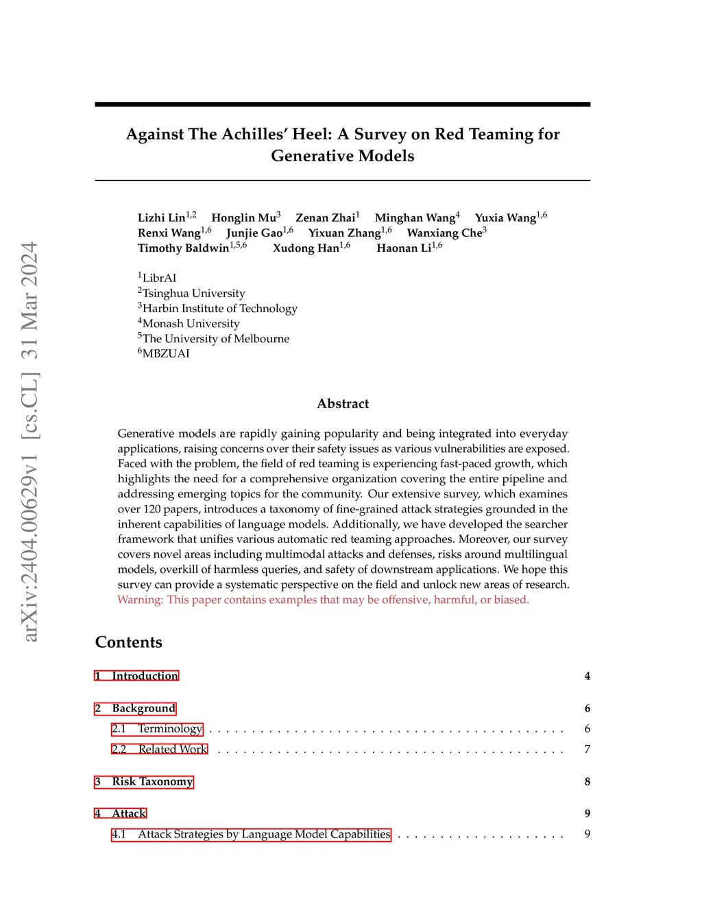 Generative models are rapidly gaining popularity and being integrated into everyday applications, raising concerns over their safety issues as various vulnerabilities are exposed. Faced with the problem, the field of red teaming is experiencing fast-paced growth, which highlights the need for a comprehensive organization covering the entire pipeline and addressing emerging topics for the community. Our extensive survey, which examines over 120 papers, introduces a taxonomy of fine-grained attack strategies grounded in the inherent capabilities of language models. Additionally, we have developed the searcher framework that unifies various automatic red teaming approaches. Moreover, our survey covers novel areas including multimodal attacks and defenses, risks around multilingual models, overkill of harmless queries, and safety of downstream applications. We hope this survey can provide a systematic perspective on the field and unlock new areas of research.